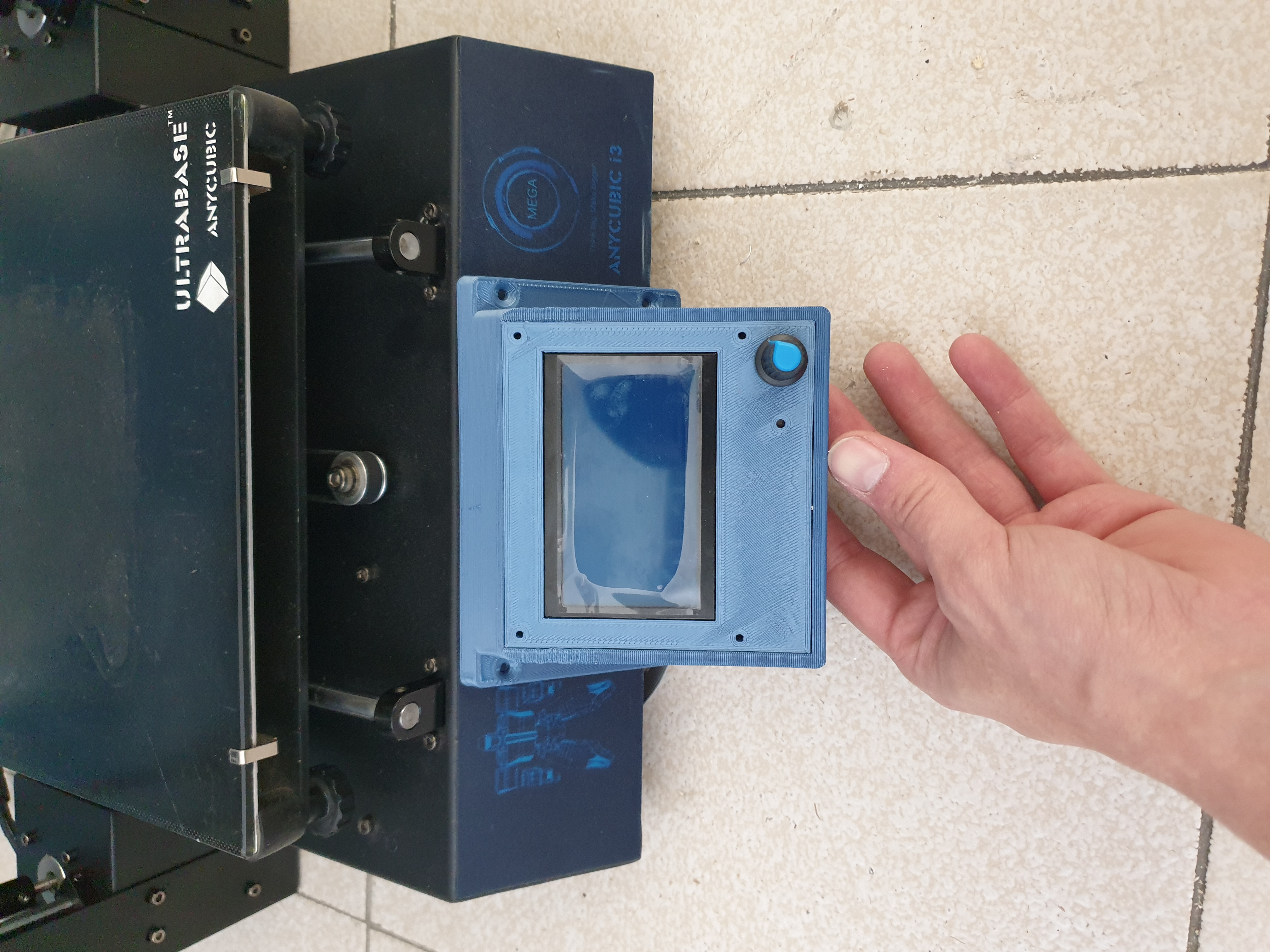 Nhưng mà anh em có thể che cái màn hình zin lại bằng mấy cái part mình thiết kế nè. Anh em sẽ phải khoét 4 lỗ trên khung máy zin (tháo màn hình Anycubic ra trước nha không thôi làm hư đó) hoặc là anh em dán cái part này lên khung bằng keo dán cấu trúc.