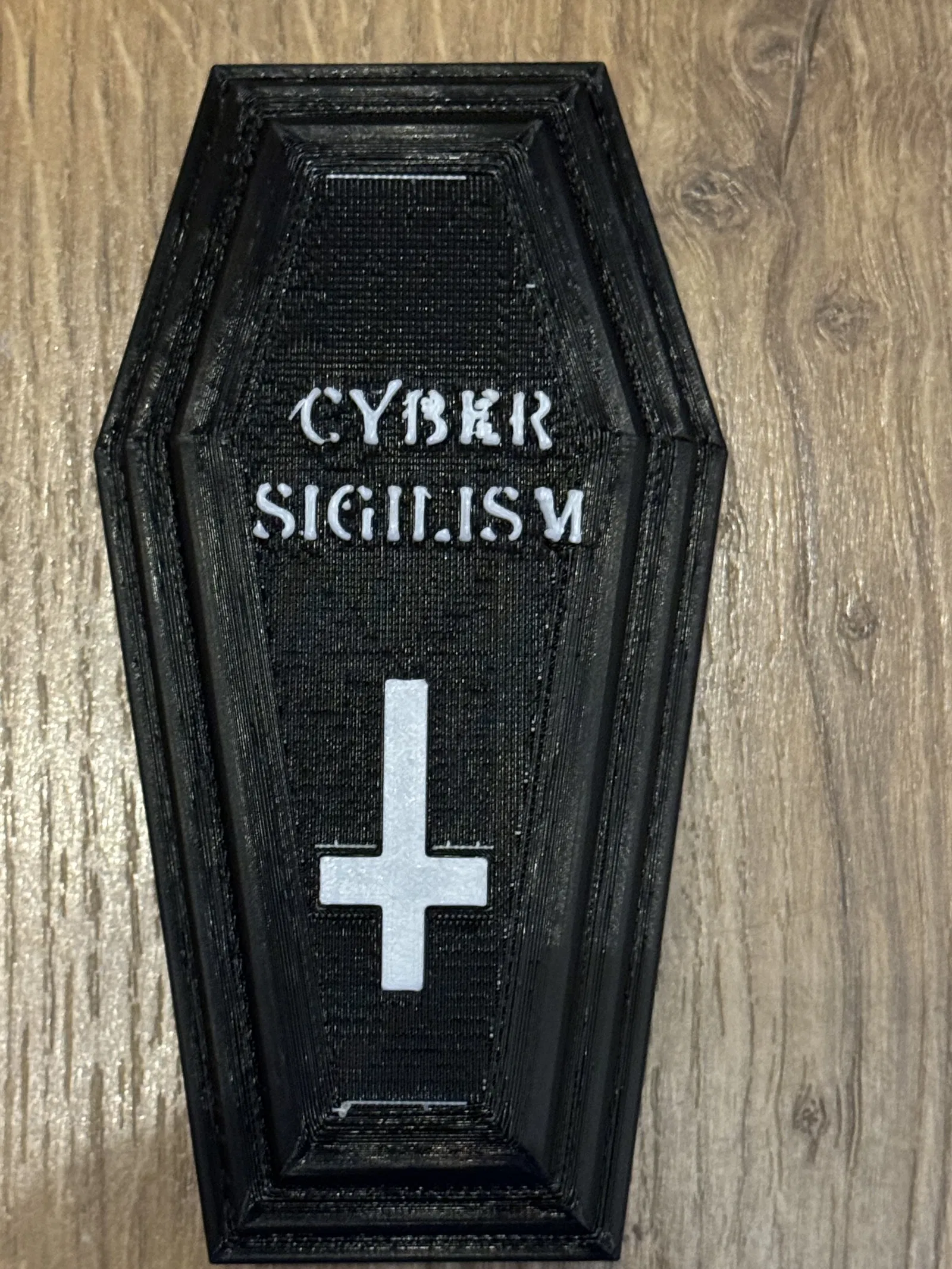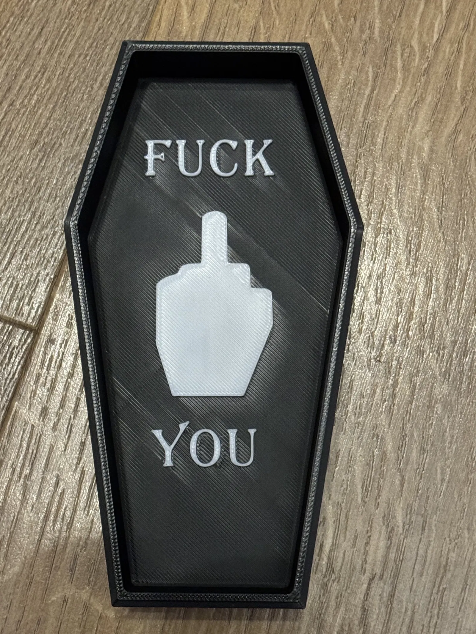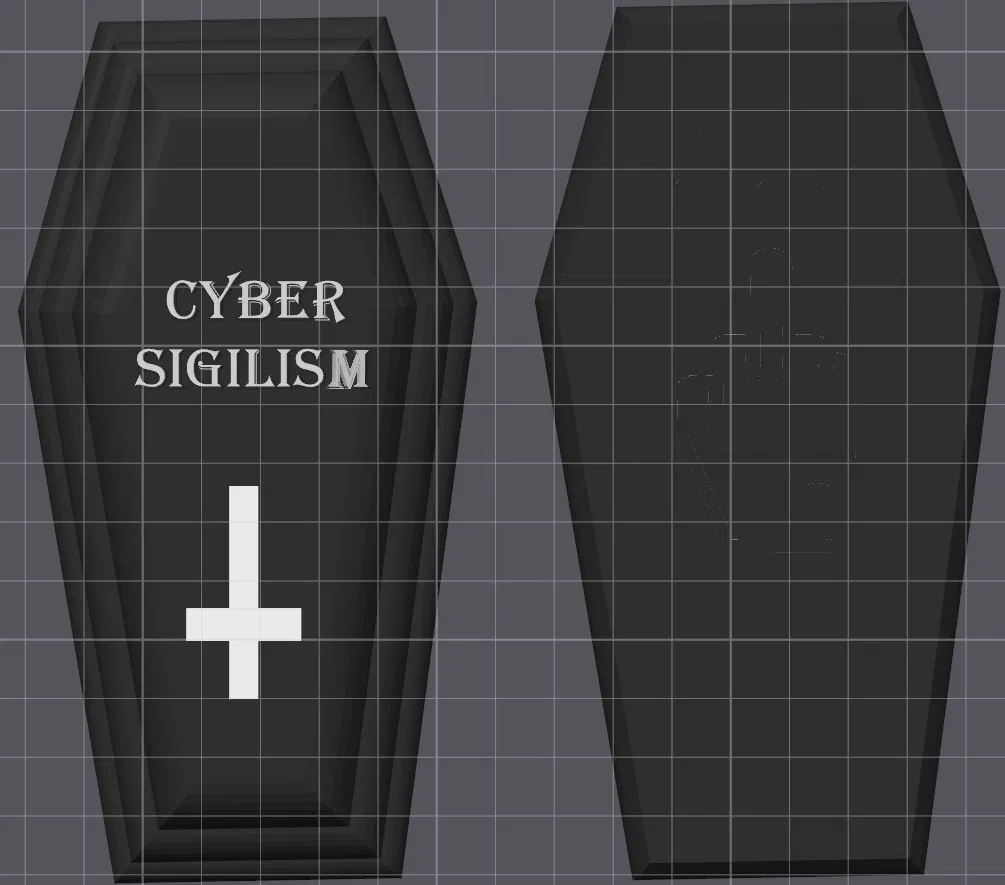 Mô hình hộp quan tài độc đáo với biểu tượng ngón giữa, mang phong cách Cyber Sigilism. Thích hợp cho những ai yêu thích sự phá cách và hài hước. In bằng PLA hoặc vật liệu tương tự.