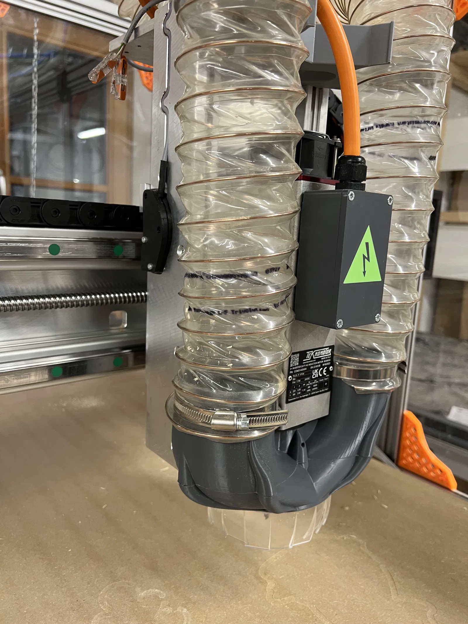 Mui hút bụi cho trục Teknomotor 1.1kW, tối ưu luồng không khí, chống quá nhiệt. Sử dụng ống 80mm, nam châm và tấm PVC. Vật liệu in đề xuất: ABS/ASA hoặc PLA. Cấu hình in chi tiết và thời gian in khoảng 8 giờ.