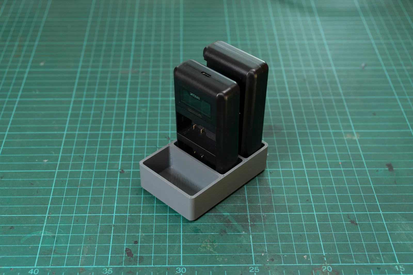Hộp chia ngăn dạng rãnh đơn giản, khớp hoàn hảo với khay IKEA Skadis. Rãnh vừa khít với bộ sạc pin máy ảnh XTAR SN4/VN2 và đế sạc dự phòng.