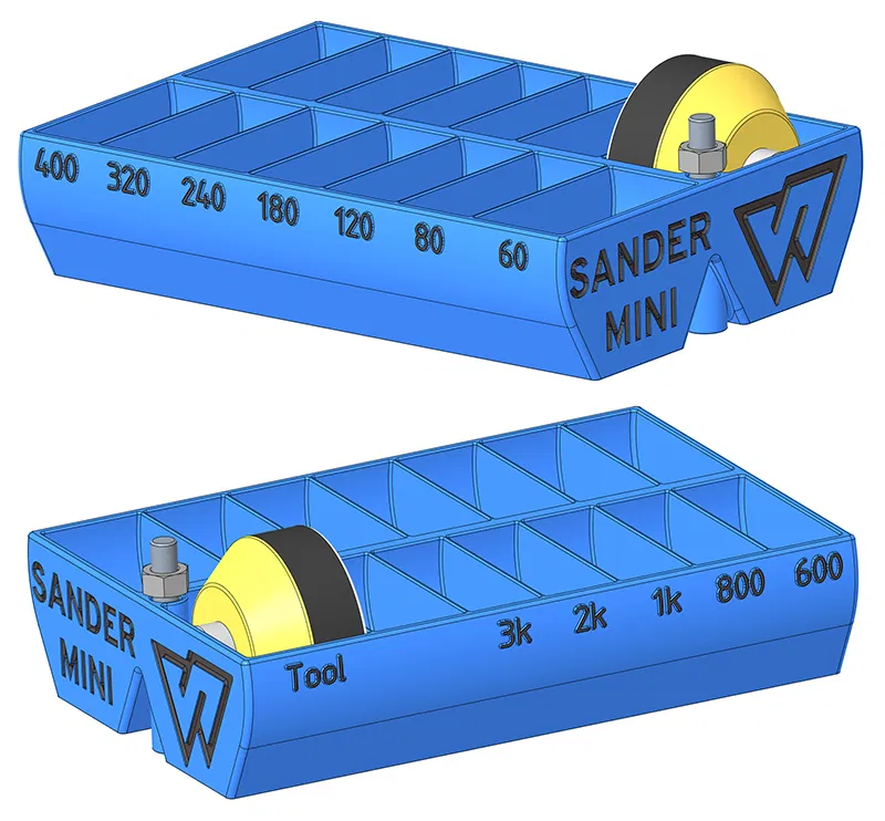 Hộp đựng đồ này dành cho máy chà nhám mini, giúp cất giữ gọn gàng và sạch sẽ tất cả các loại đĩa chà nhám. Thiết kế này không cần support hay brim, phù hợp in 3D bằng PLA hoặc PETG.