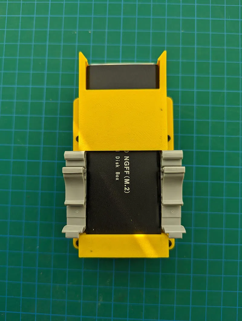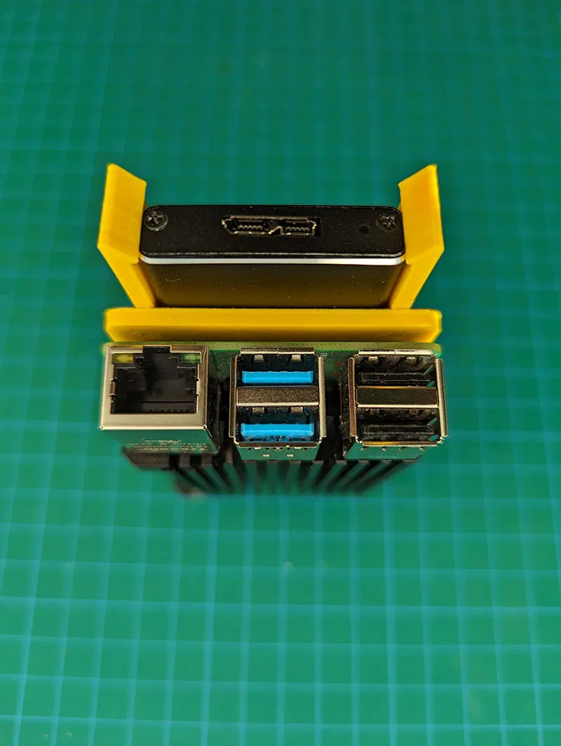 Cái đế RPi 4B và SSD này được thiết kế để tối giản diện tích nhất có thể. Tui muốn xài chung với mấy cái kẹp kim loại bán sẵn vì thấy nó cứng cáp với đàn hồi hơn mấy cái in 3D. Mọi thứ được in bằng PETG với độ cao lớp 0.2mm. Các bộ phận được thiết kế để dán lại với nhau bằng các chốt định vị, nên không cần in support.