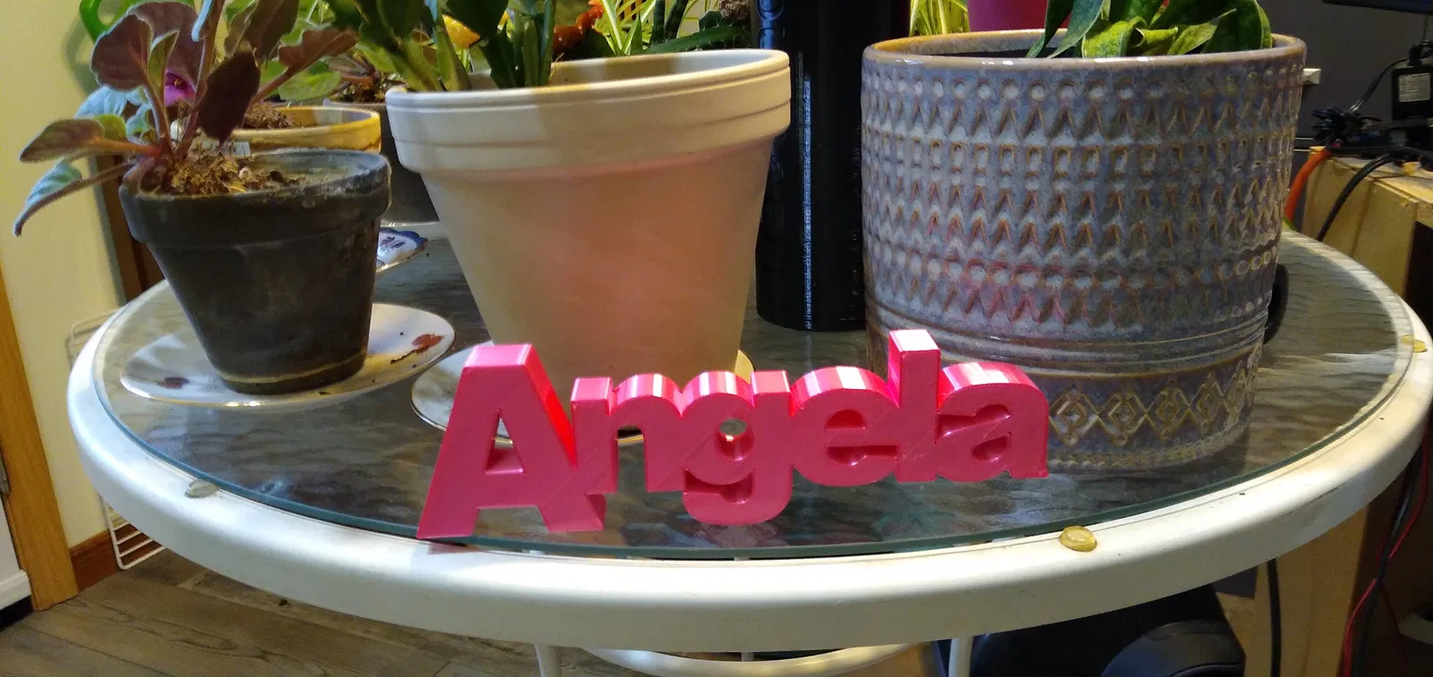 Angela dài 234 mm x cao 65 mm x dày 20 mm. Nó được tạo bằng SketchUp 2015 sử dụng font Arial bold. Tui in nó bằng PLA màu hồng. Phần ‘Ang’ có độ đặc ruột (infill) cao hơn phần ‘ela’ để tránh bị nghiêng. Xem file .3mf nha.