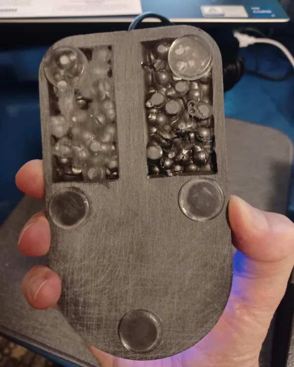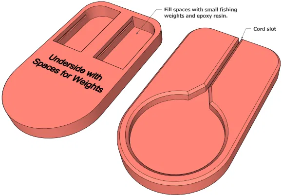 Đế có trọng lượng giúp giữ chặt 3DConnexions SpaceMouse (Compact, Có dây) khi làm việc. Có khe cắm dây, chỉ vừa cho bản có dây. Đổ đầy khoang dưới bằng dây câu và keo epoxy, dán chân cao su chống trượt để giữ chắc trên bàn.