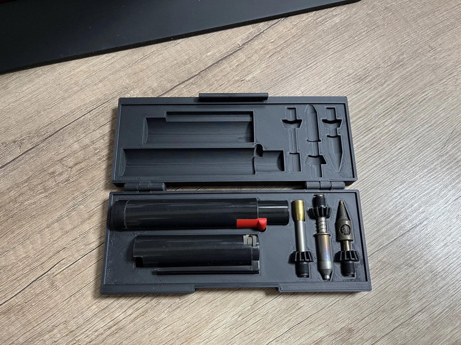 Tui đã có cây mỏ hàn ga Portasol này xài hơn 20 năm rồi. Giờ đây tui có thể đựng gọn bộ mỏ hàn và các mũi hàn trong chiếc hộp đơn giản này. Nguyên cái hộp này in ra là xài liền, không cần thêm bộ phận hay công đoạn lắp ráp gì thêm. Tui recommend xài PETG nha.