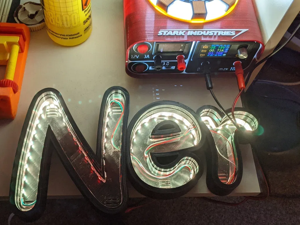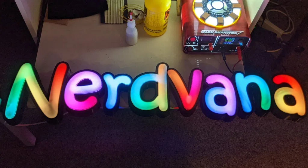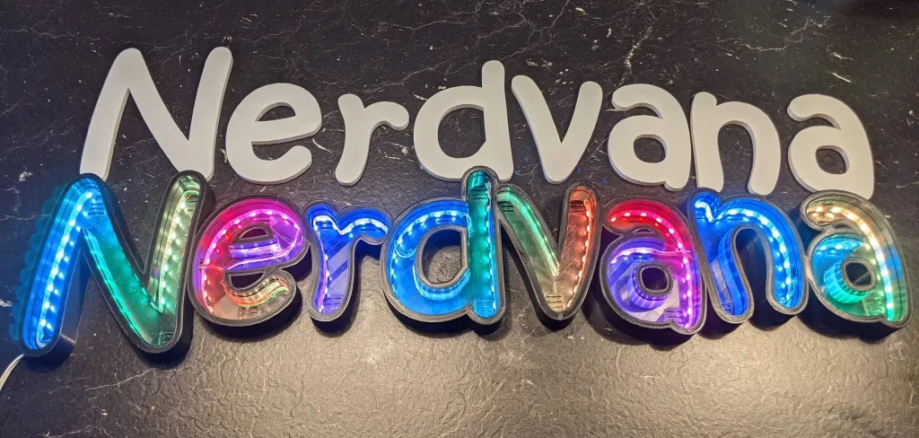 Tôi muốn làm mới văn phòng tại nhà (còn gọi là "Nerdcave") và có một dải đèn LED WS2812B để sẵn đó… Vài phút sau, máy in của tôi bắt đầu in những bộ phận đầu tiên của một biển hiệu Nerdvana marquee kích thước 800x180mm.