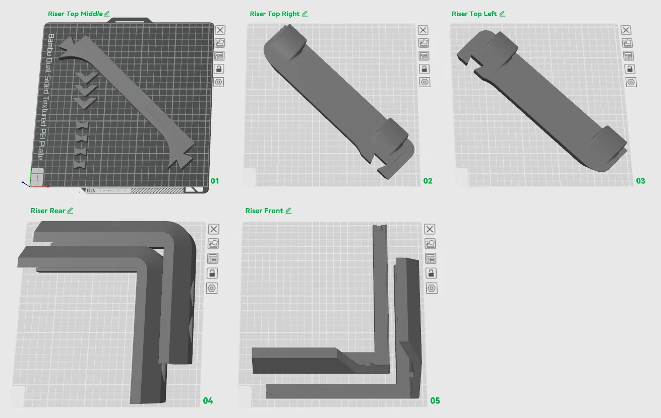 Tôi muốn một bộ nâng AMS sử dụng ít hơn một cuộn dây tóc, rất chắc chắn, cho phép tôi mở nắp trên để thông gió, có khe hở đủ lớn ở trên để làm việc trên đầu in và tất nhiên là có đủ không gian cho AMS. Vì vậy, tôi đã tự thiết kế bộ nâng AMS của riêng mình. Nó chắc chắn đến mức tôi có thể đứng lên trên đó. Với cài đặt in của tôi (xem bên dưới), nó sử dụng 840gr dây tóc và có thể in trong khoảng 24 giờ. Tất cả các cài đặt của tôi và cách sắp xếp các bộ phận trên năm tấm in đều có trong tệp 3MF. Bạn cũng có thể tải xuống tệp Step để tùy chỉnh hoặc chỉnh sửa.