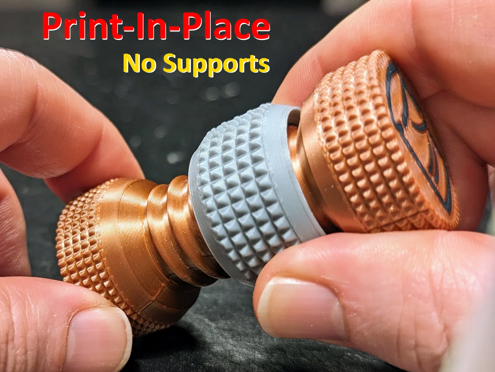 In từ từ thôi, đừng có vội. Xài độ cao lớp 0.16mm. Lớp 0.2mm cũng xài được nhưng mấy chỗ "overhang" nhìn không đẹp lắm. Dùng 3 lớp tường, 5 lớp trên, 4 lớp đáy, 8% infill dạng gyroid và không cần support. Chỉnh tốc độ là 60mm/s cho bề mặt ngoài, 120mm/s cho bề mặt trong, 60mm/s cho các lớp trên cùng và 200mm/s cho tất cả các infill. Cái logo của tui sẽ không thấy trên mấy bản in một màu đâu. Bản in này chắc tốn khoảng 100 phút trên P1S và 180 phút trên I3 Mega. Nếu muốn, bạn có thể in full màu bằng cách tách cái STL ra thành các phần riêng biệt. Chọn màu khác nhau cho con ốc, cái vòng và cái logo. Nếu không thích logo của tui thì cứ chọn cùng màu/chất liệu với con ốc. Logo sẽ biến mất sau khi slice. Bản in nhiều màu sẽ tốn khoảng 5.5 tiếng.