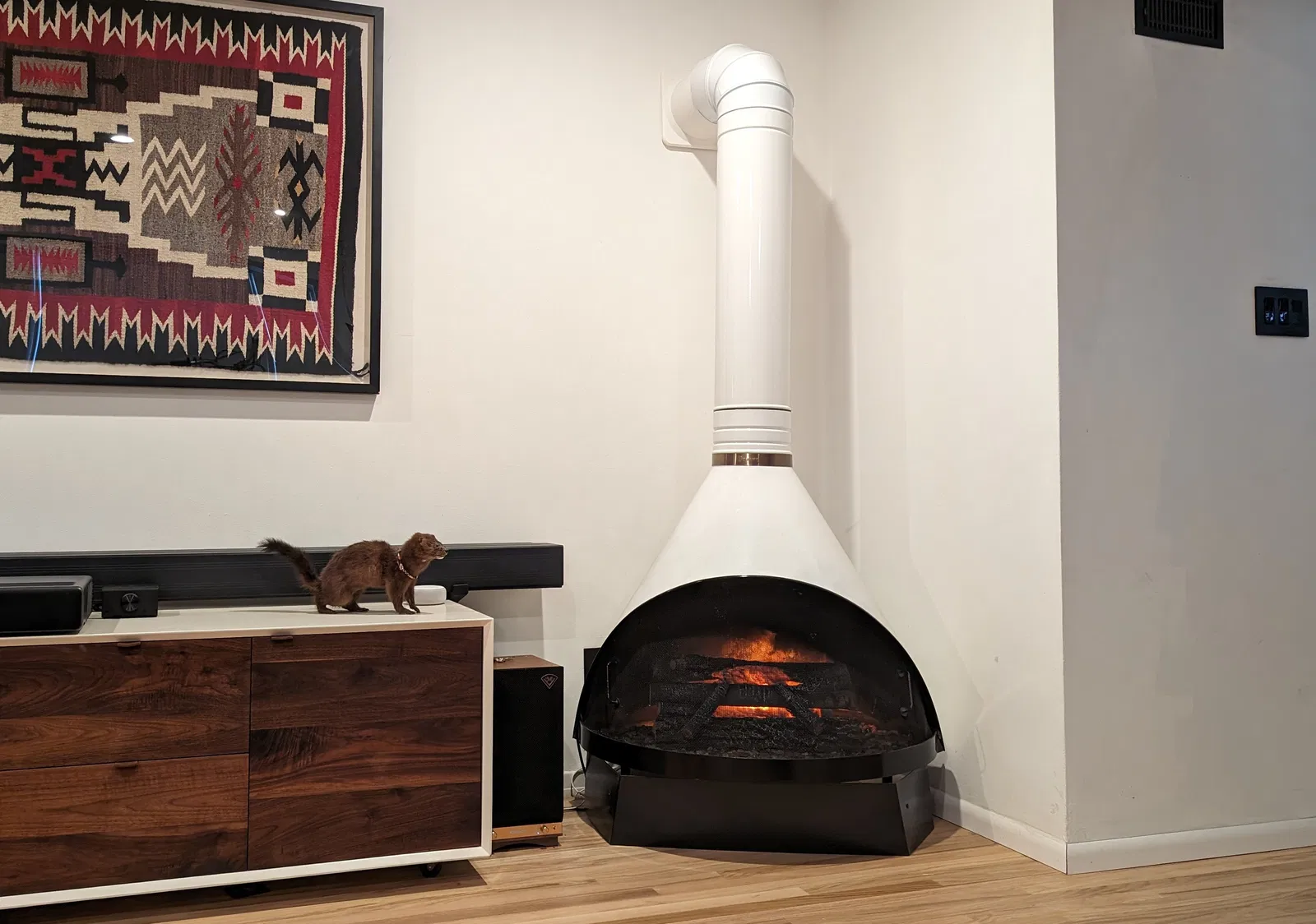 Ống thoát khí treo tường cho lò sưởi dáng Kiểu Hiện Đại Giữa Thế Kỷ. Vừa với đường kính 8 inch nhưng có thể thay đổi kích thước theo ý muốn.