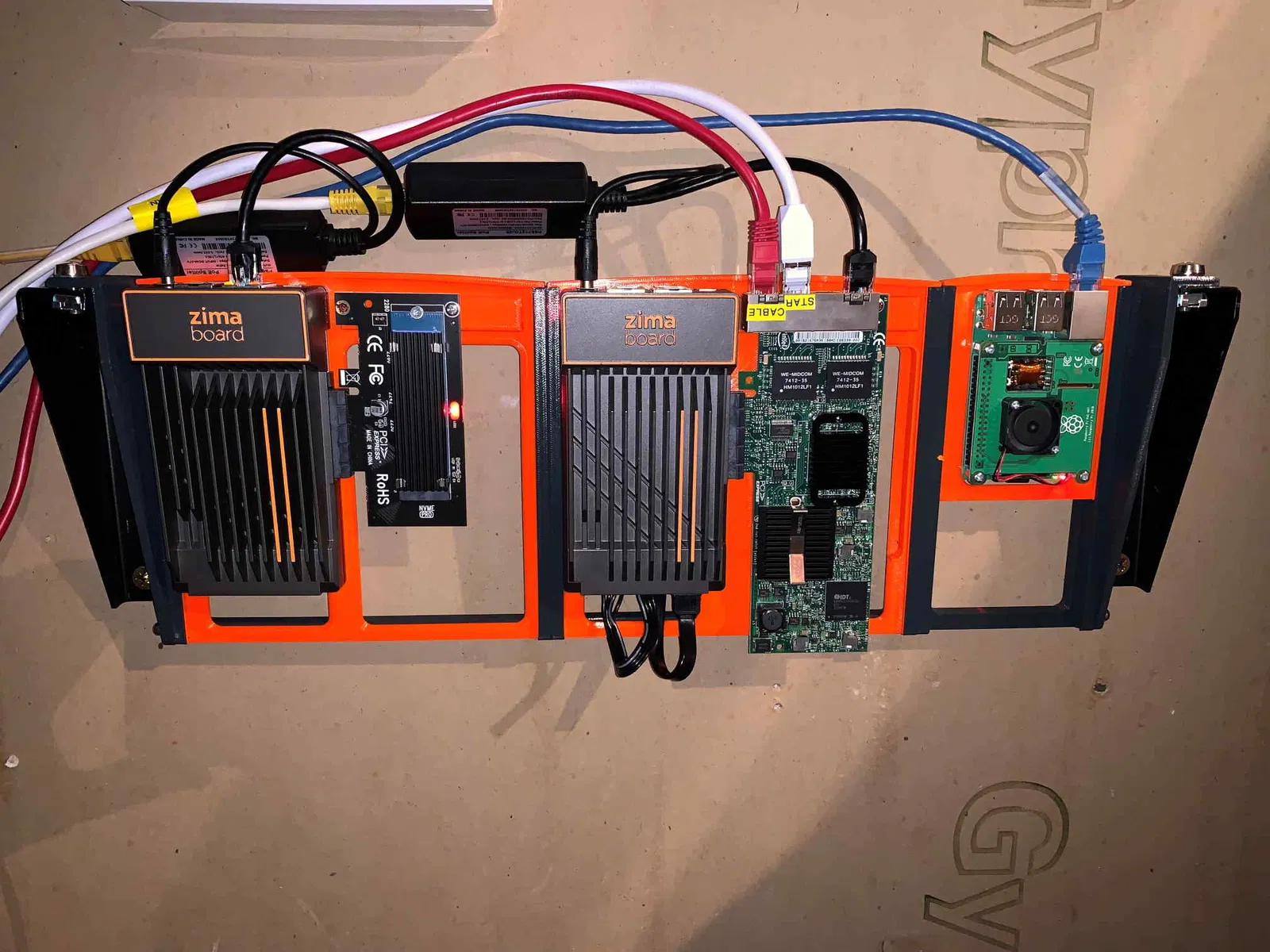 - Một ZimaBoard gắn trên bệ hỗ trợ 2 x 2.5" 7mm SSD drives, sẽ cao hơn một chút so với 1U, nhưng chỉ hơn một vài mm.