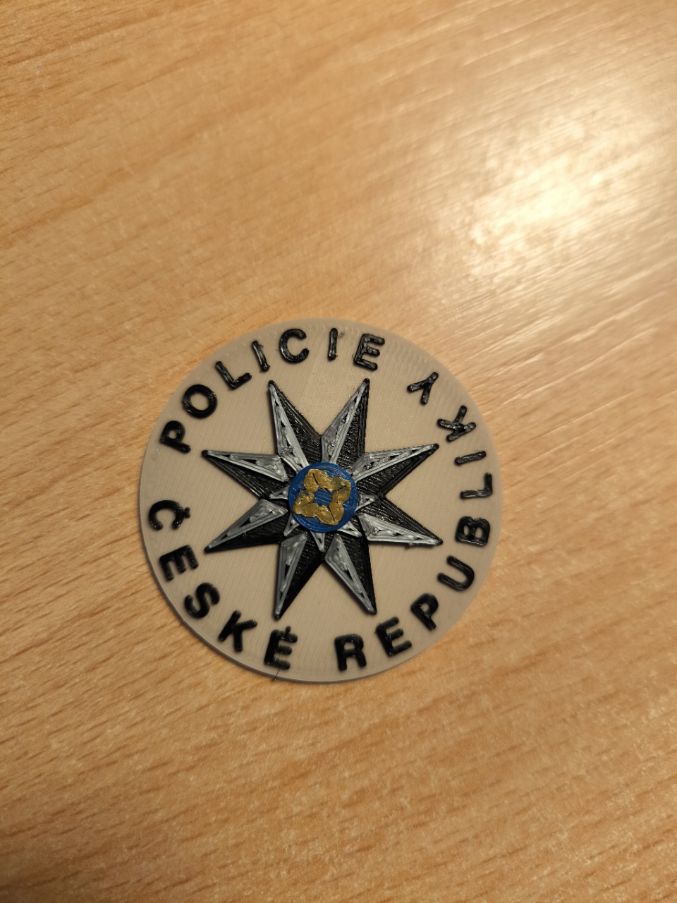 Logo Cảnh sát Cộng hòa Séc, có thể in để gắn lên mũ. Logo được chia thành nhiều phần để in nhiều màu, với các lớp màu chi tiết cho bạn dễ dàng tái tạo lại sản phẩm gốc. Kích thước có thể tùy chỉnh, nhưng nên in ở độ cao 0,1mm để tách màu tốt nhất.