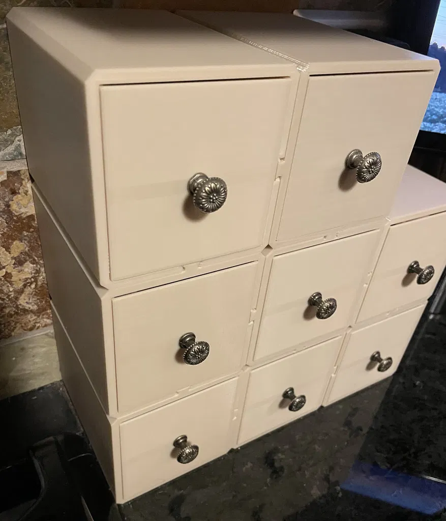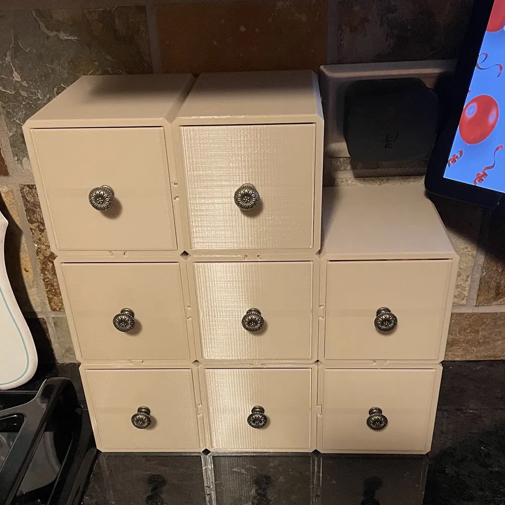 Tự tạo cho mình một phiên bản "Hệ Thống Tổ Chức Module" lớn hơn. Hệ thống này bao gồm 8 module kết nối và 8 ngăn kéo. Bạn có thể tùy chỉnh với núm vặn bằng đồng thau cổ và các bộ phận khớp chặt chẽ với nhau. Kích thước mỗi module: 96x96x127mm. Sử dụng PLA+ để in và tận hưởng sự tiện lợi!