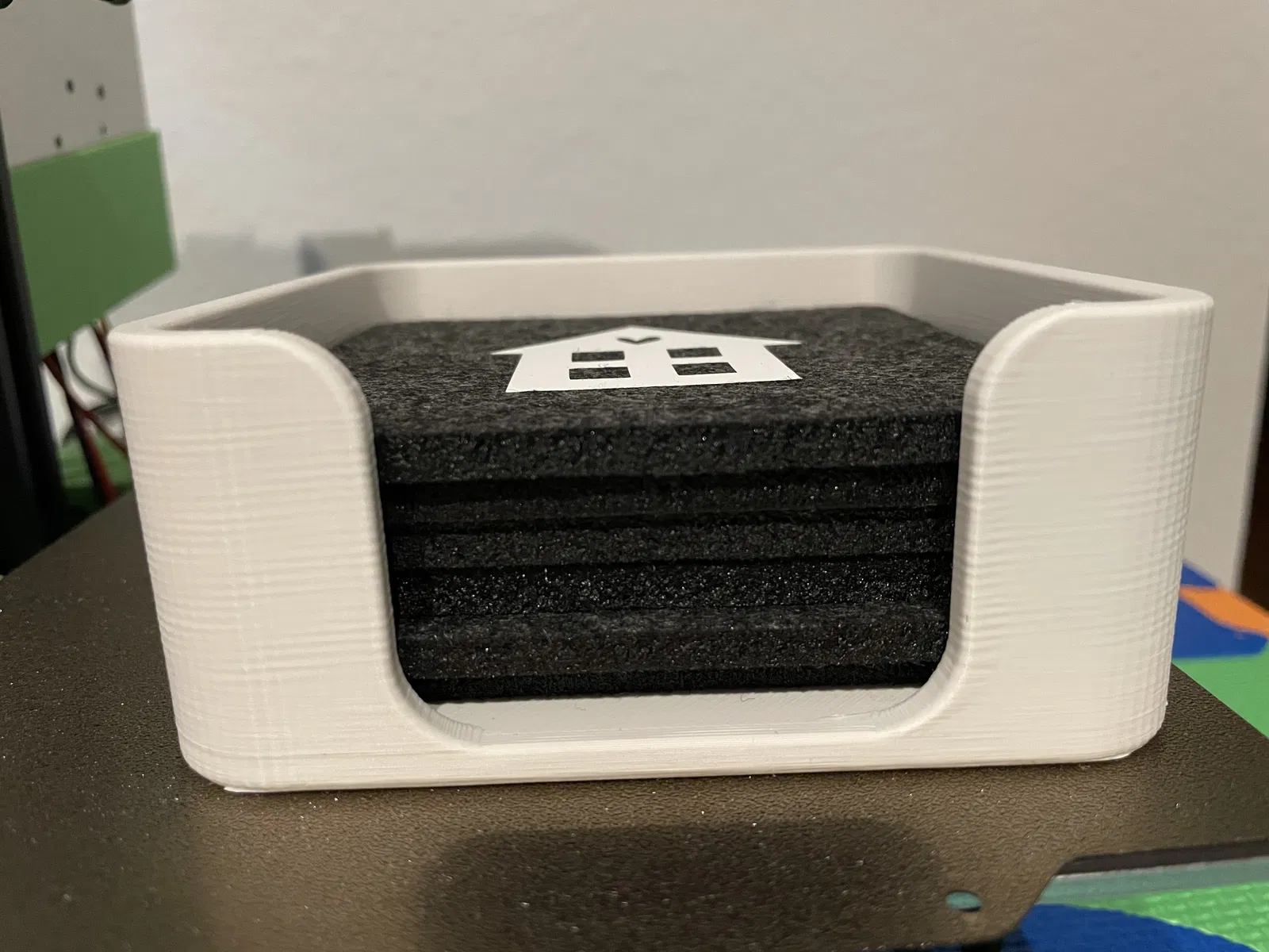 Khay đựng đế lót ly hình vuông, chứa được tối đa 8 đế lót ly vuông với kích thước 107x107mm và độ dày 5mm. Dễ in, không cần hỗ trợ, bo tròn các góc.