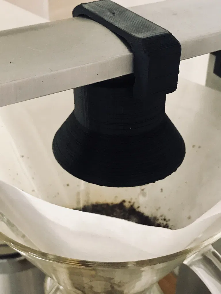 Tôi đã tạo ra cái này để phân phối nước tốt hơn, tạo ra một mẻ pha Chemex tự động tốt hơn, hoạt động rất đẹp. Cái vòi phun này dễ dàng tháo rời, trong khi phần trên có thể giữ nguyên vị trí ngay cả trong quá trình pha "thông thường". Cái vòi phun có một hình trụ ngắn đóng vai trò là bể chứa nước và giúp nước không bị tràn (không hề bị tràn).