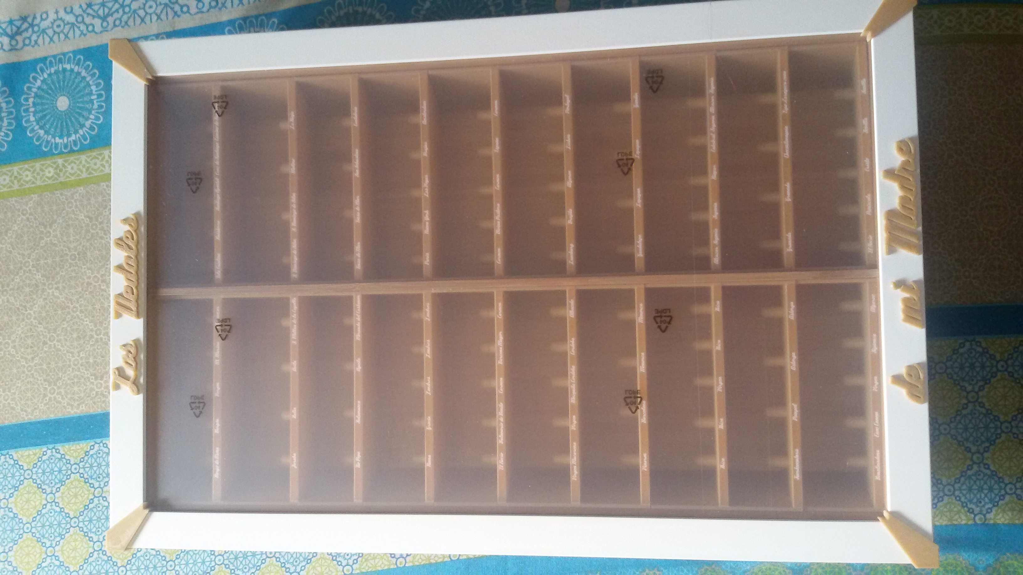 Kệ trưng bày đê – được làm từ khay Ikea http://www.ikea.com/es/es/catalog/products/30242743/ và khung http://www.ikea.com/es/es/catalog/products/80117039/#/90186051 với các chiều cao và khoảng cách khác nhau tùy theo kích thước của đê.