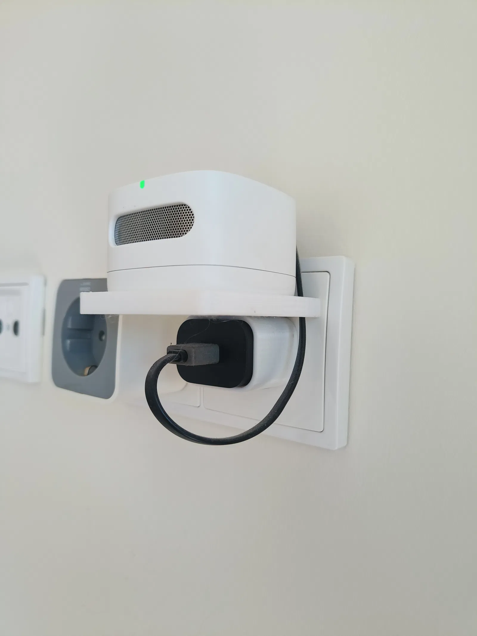 Cái đế giữ Amazon Smart Air Quality Monitor, gắn vô cục sạc luôn, thiết kế không cần support. In sát vô cục sạc để không bị rớt, có lỗ luồn dây sạc và chỗ giấu dây cho gọn. Nhớ cẩn thận với độ chính xác máy in nha anh em!