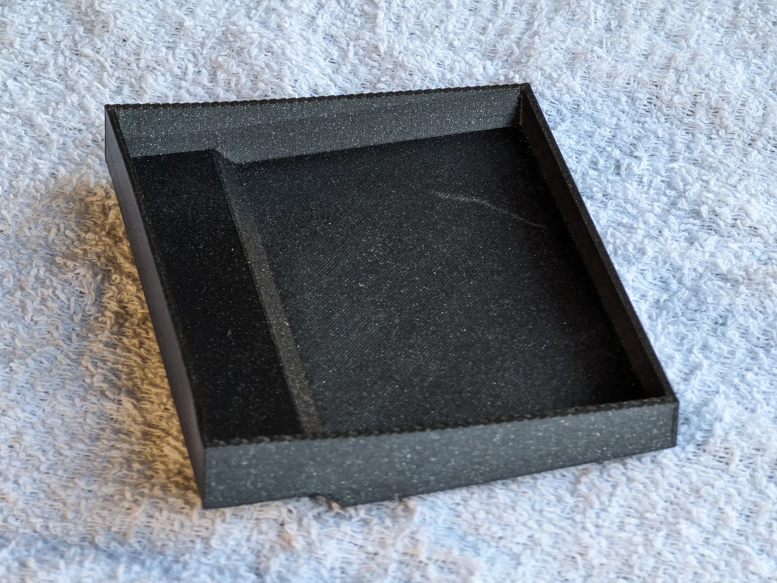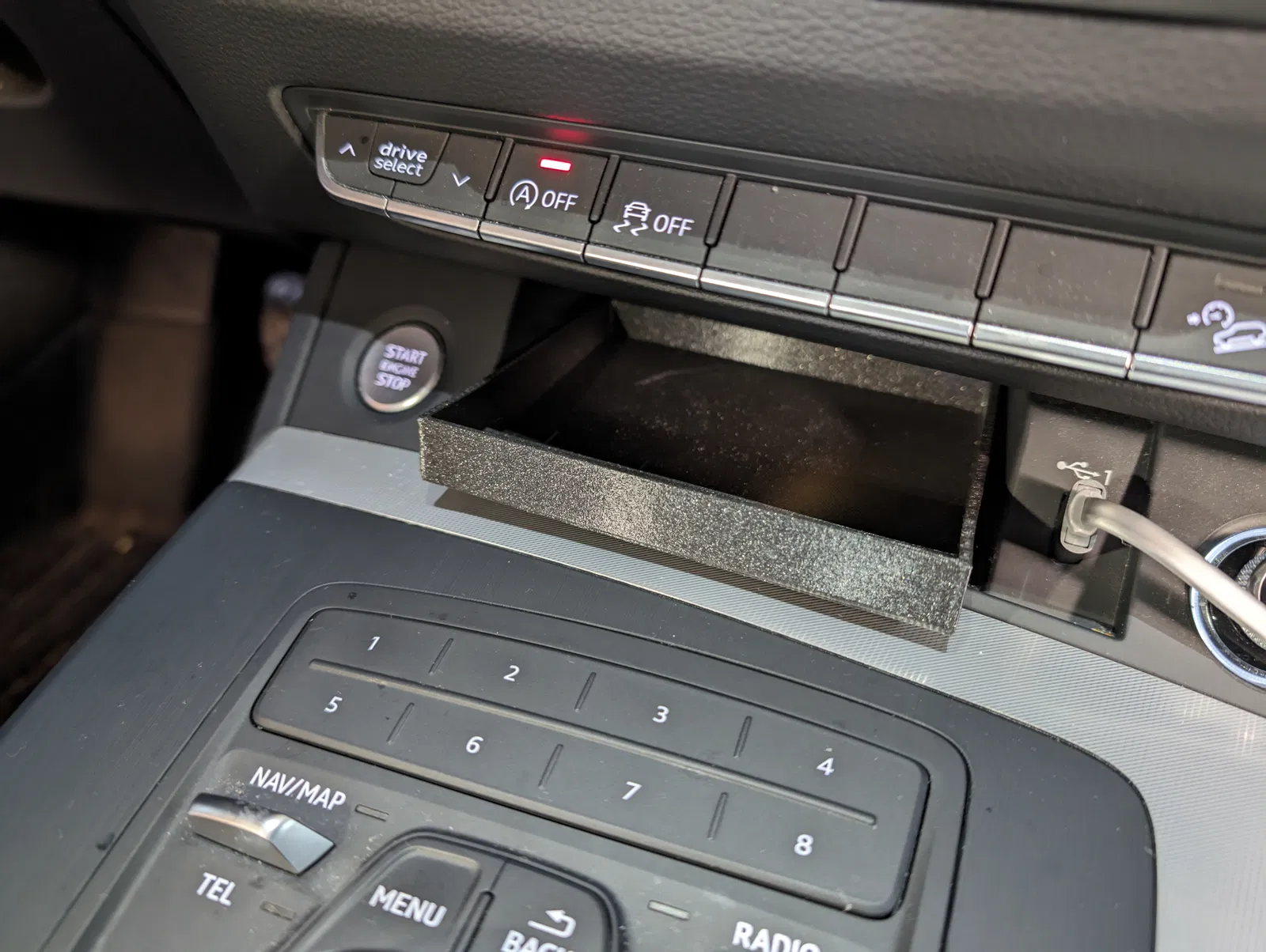 Chiếc Audi Q5 đời 2018 có một cái hốc nhỏ, nằm ngay phía trên các nút cài đặt radio. Mấy cái thẻ hay đồ vật nhỏ cứ bị rơi ra mỗi khi mình vào cua gắt, nên mình đã làm ra cái khay nhỏ này để khắc phục. Nó chưa hoàn hảo nhưng xài được. Có thể sẽ vừa với các đời và các mẫu xe Audi khác.