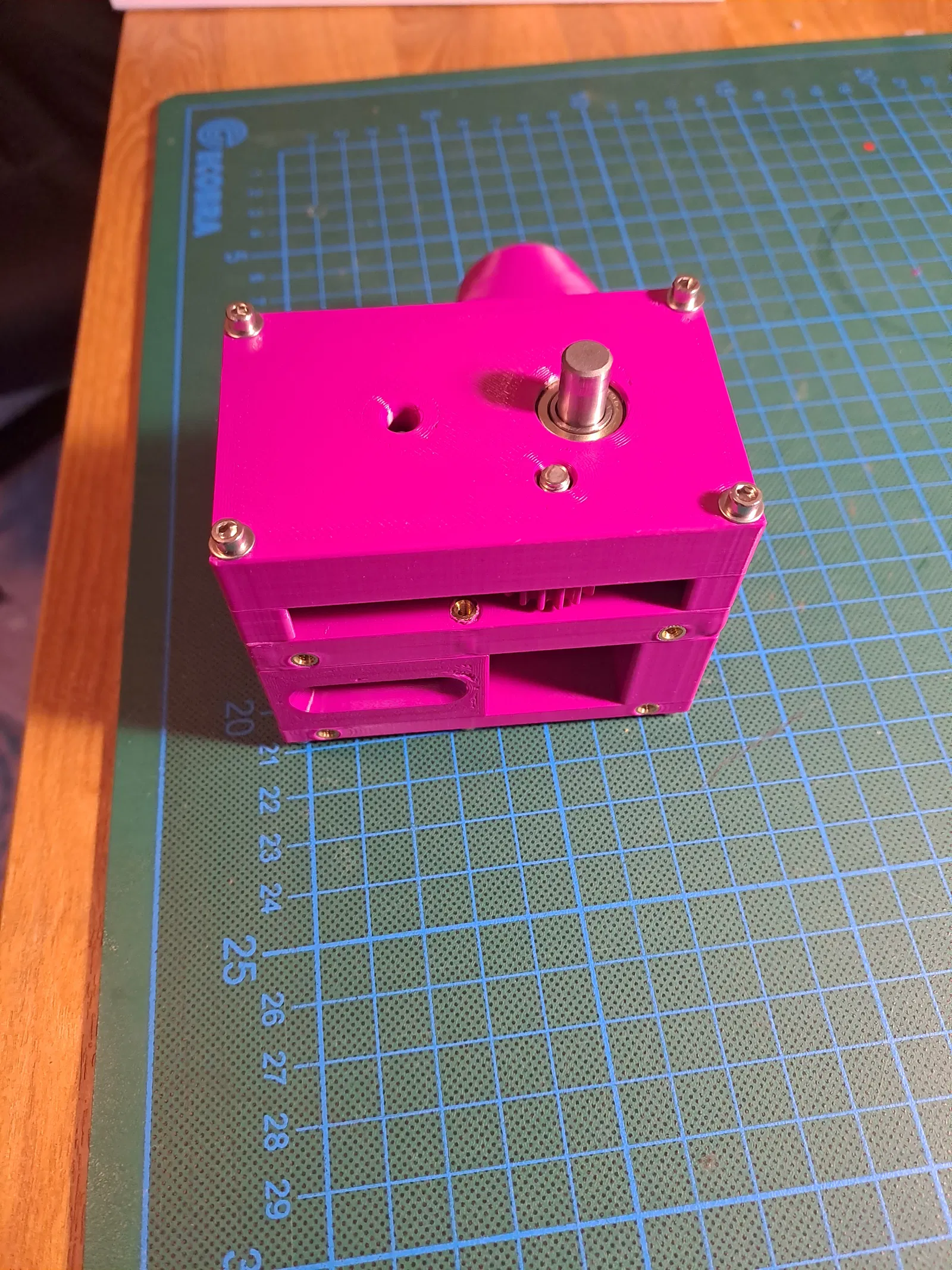 - 2 vòng bi 8x19x6 (đi kèm với mũi phay) Tui cũng đã thay đổi hầu hết các file để thêm bo góc (fillets) và vát cạnh (chamfers) khi thích hợp và sử dụng bộ chuyển đổi PET collection adapter (https://www.f3d.vn/3d-model/99450-may-tao-hat-filament-ma-nguon-mo-tu-nap-lieu-ban-sua-doi) thay vì cái cũ. In bằng PET với cài đặt Strength 0.2 mm (6 lớp tường và 25% infill).