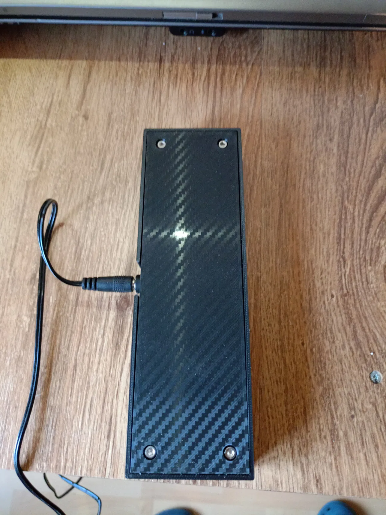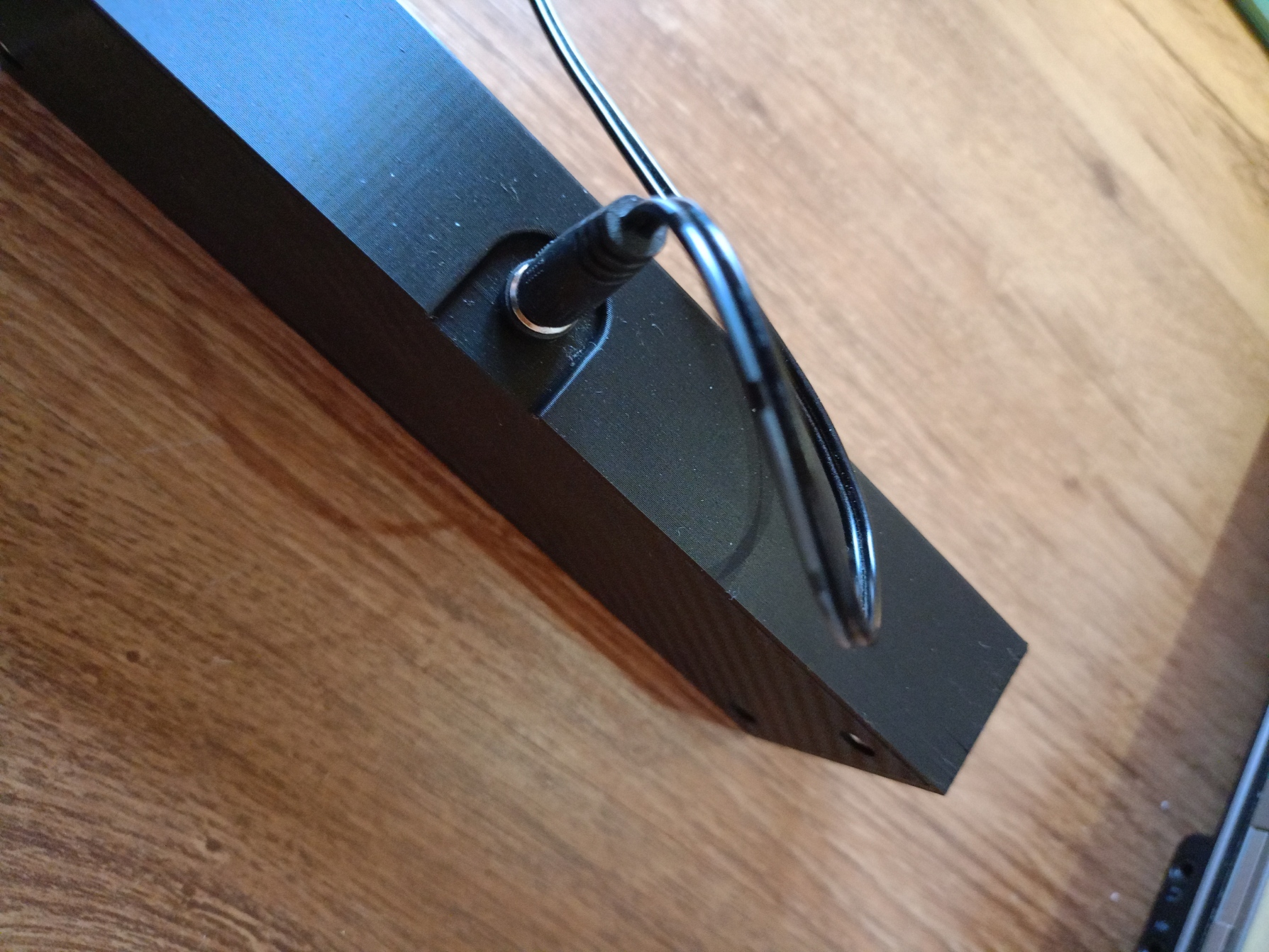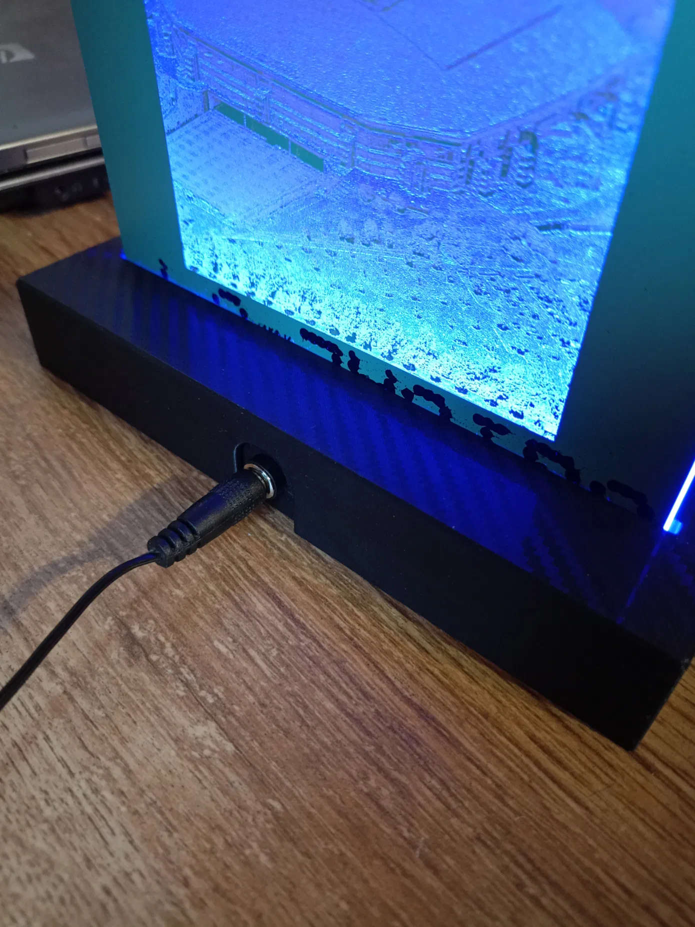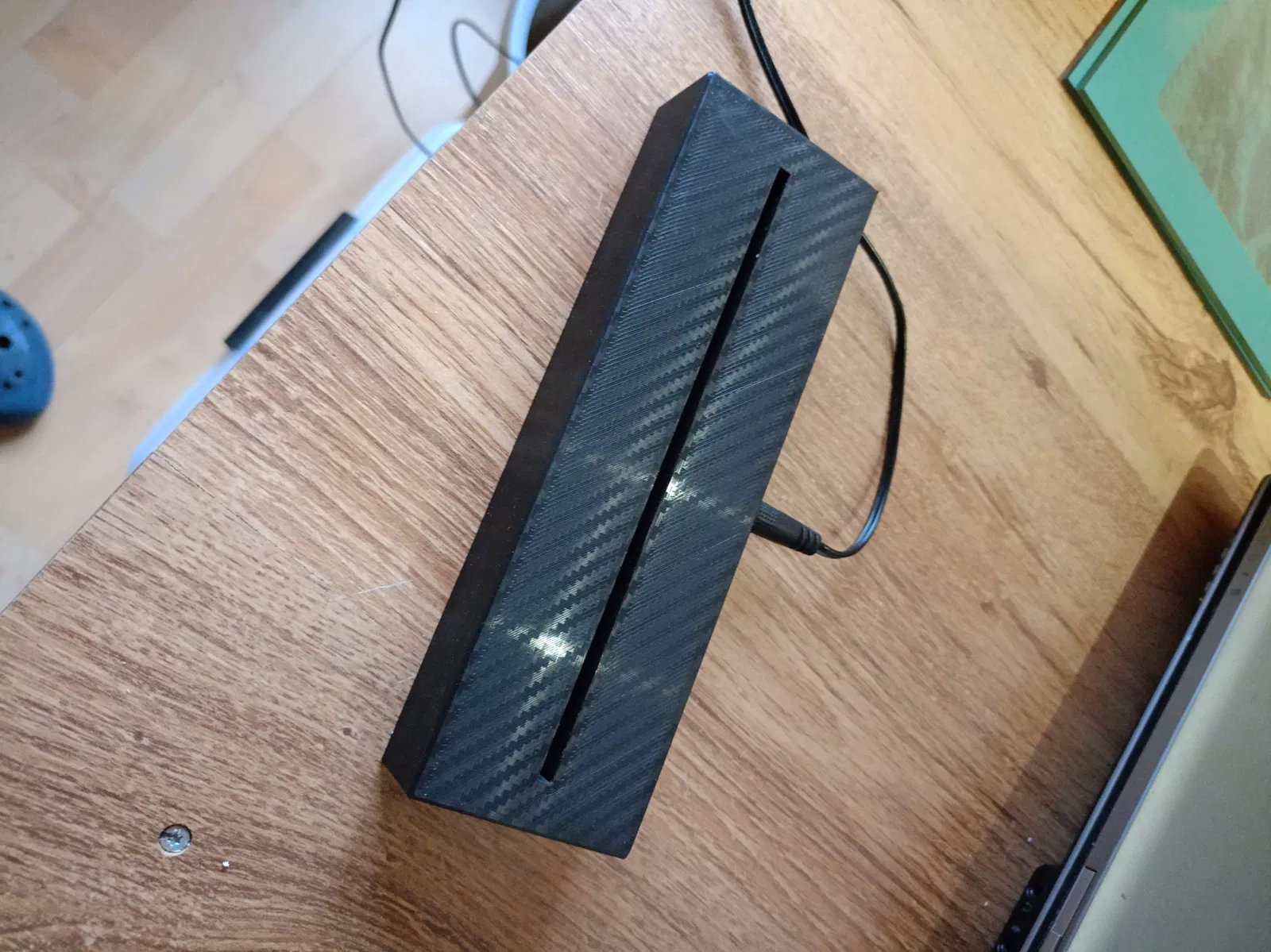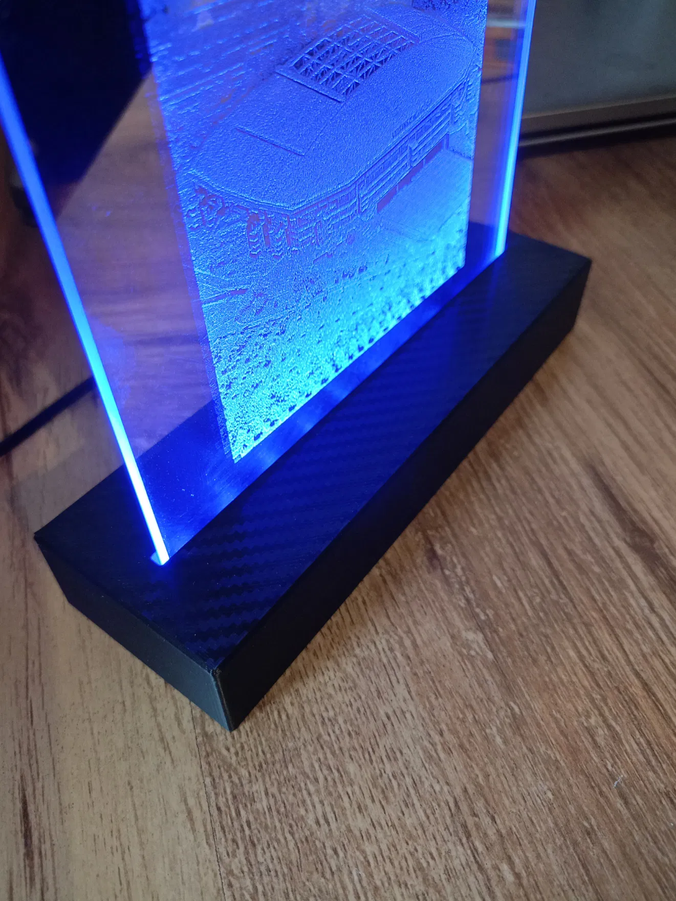 Đây là một chân đế có đèn cho các đĩa/gương được khắc (bằng laser). Khe cắm dài 152mm và rộng 3,3mm. Ở mặt sau có một cổng DC. Hai bộ phận được bắt vít với nhau bằng ốc M3. Phần trên có ren chìm cho việc này. Tôi đã đạt được hiệu ứng sợi carbon bằng một tấm in đặc biệt.