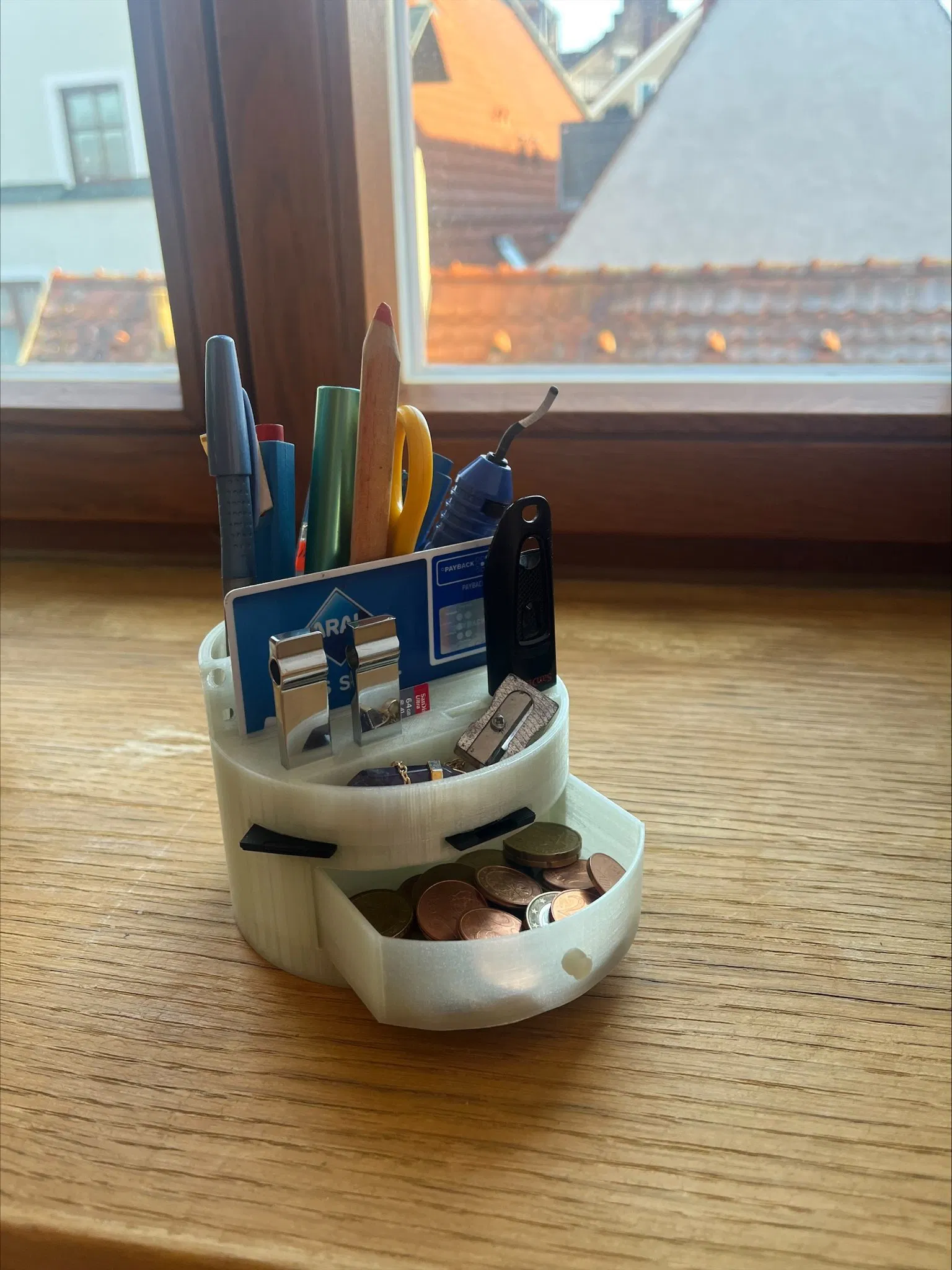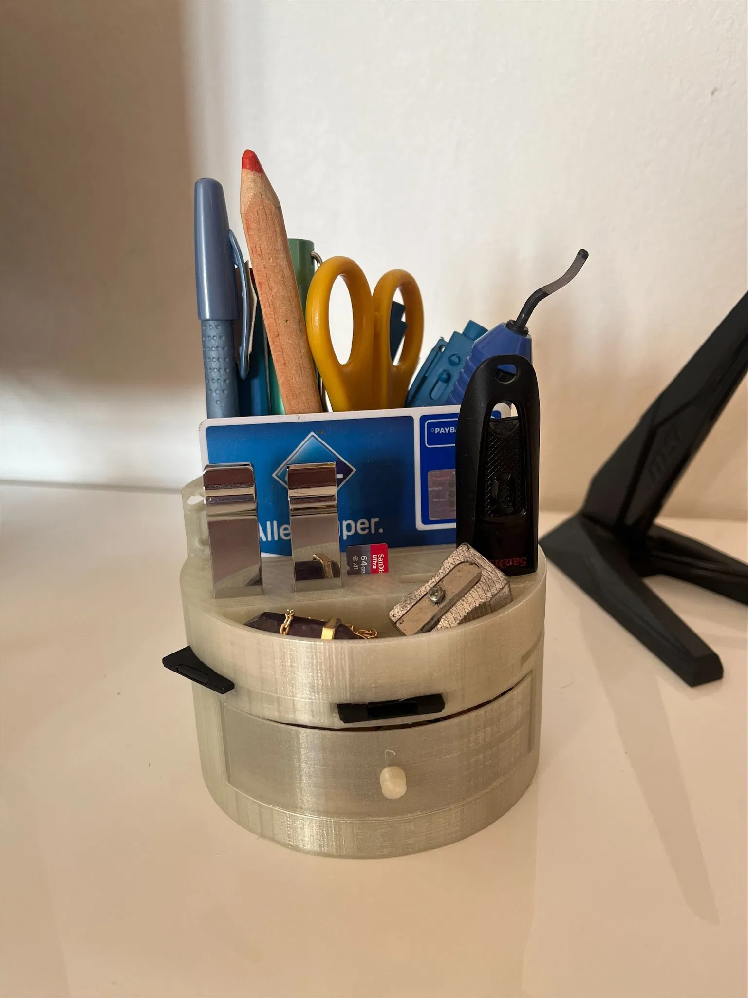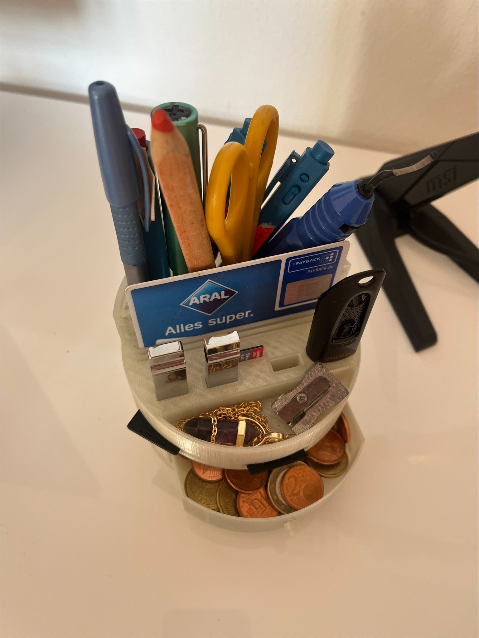 Mẫu hộp đựng đồ văn phòng đa năng, in dễ dàng. Có ngăn đựng USB, thẻ nhớ, adapter, thẻ tín dụng, tiền xu, và bút. Kích thước: đường kính 10cm, cao 7.8cm. Cần một ít keo để lắp ráp.