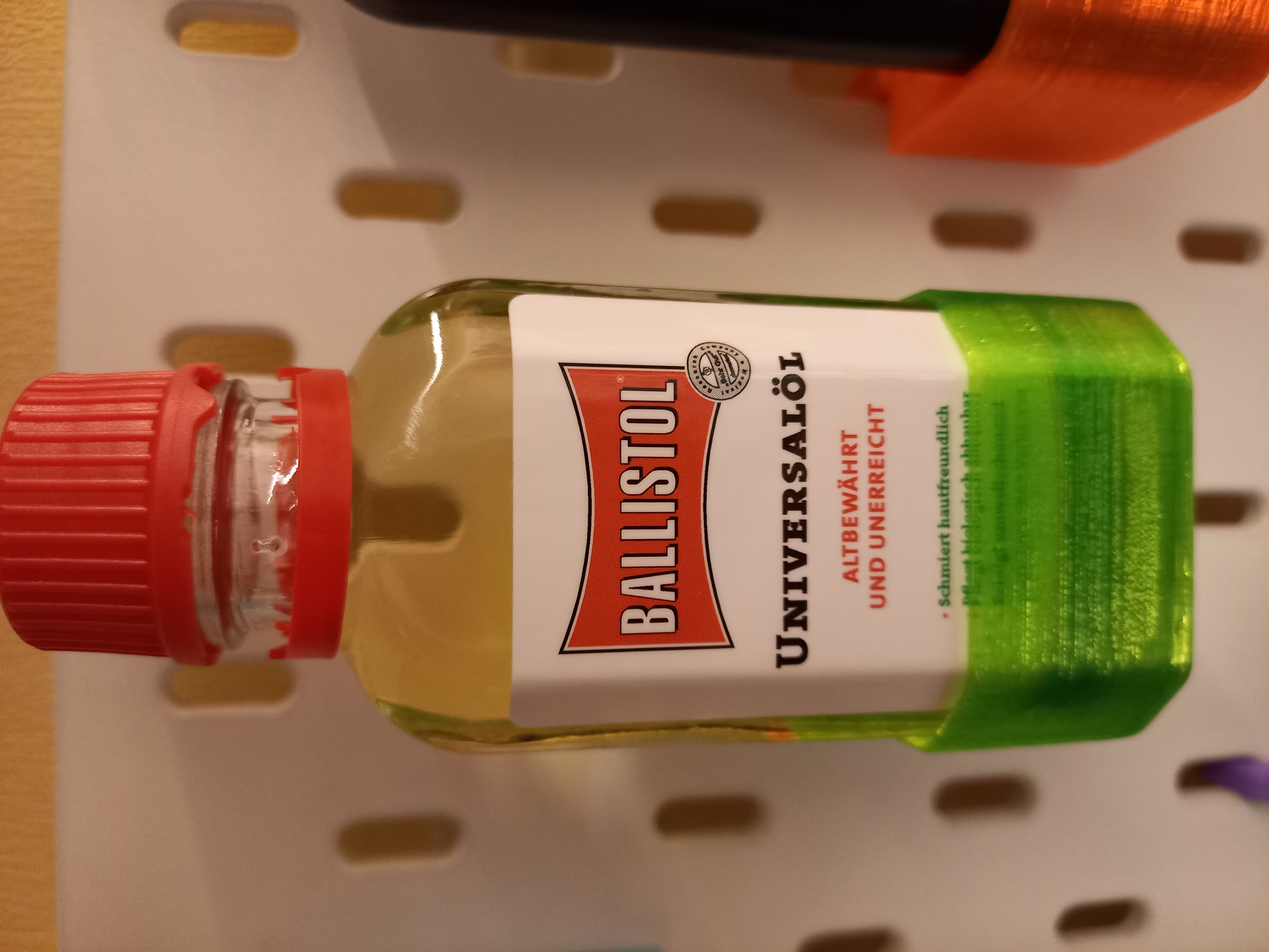 Tái chế để sử dụng hệ thống móc treo đa năng. Có hai phiên bản: một bản giữ nguyên hình dạng ban đầu nhưng hơi lung lay, và một bản "dài" kết nối hoàn toàn với bảng pegboard. Hàng làm từ nhựa PLA, file STL miễn phí.