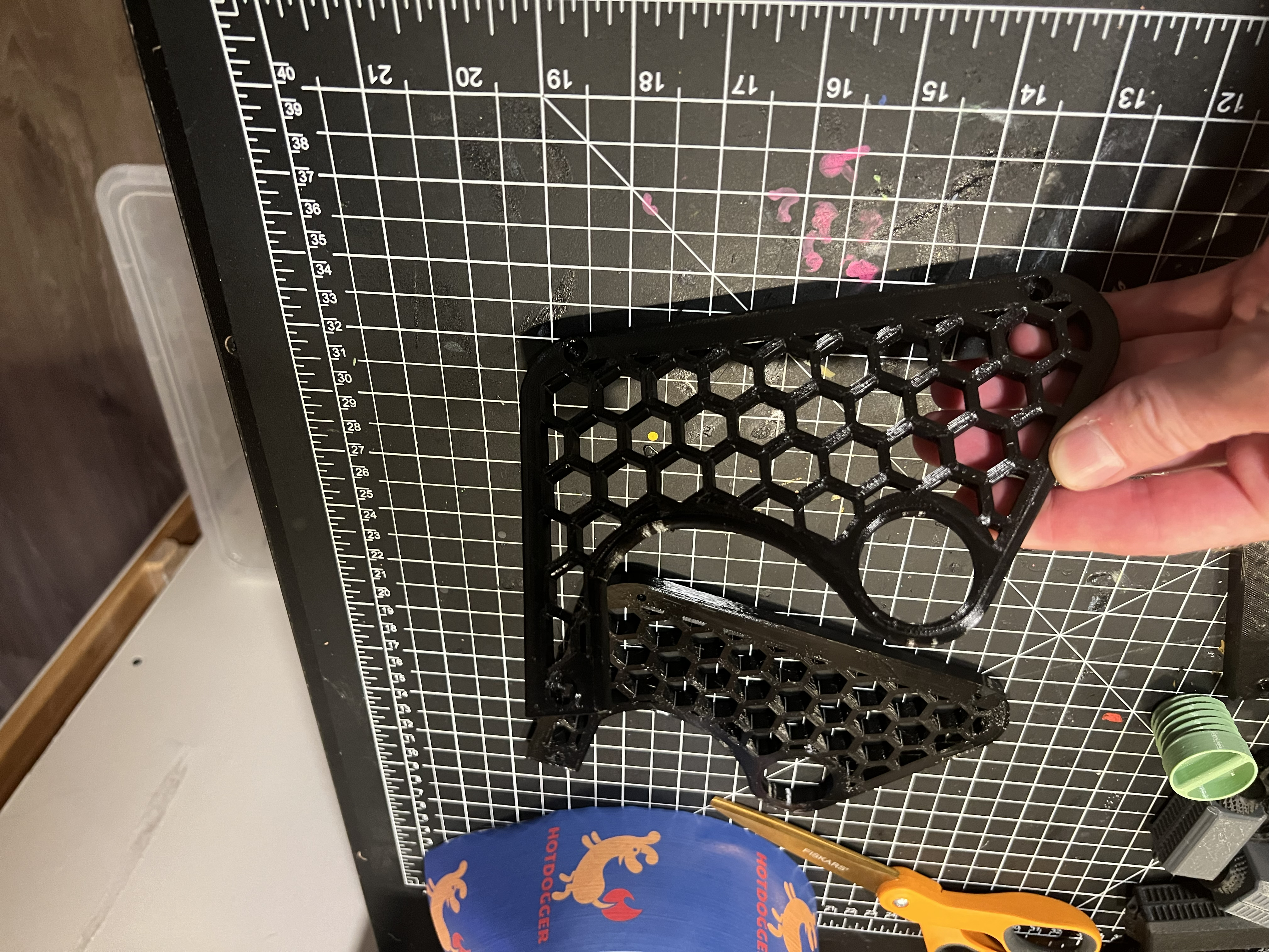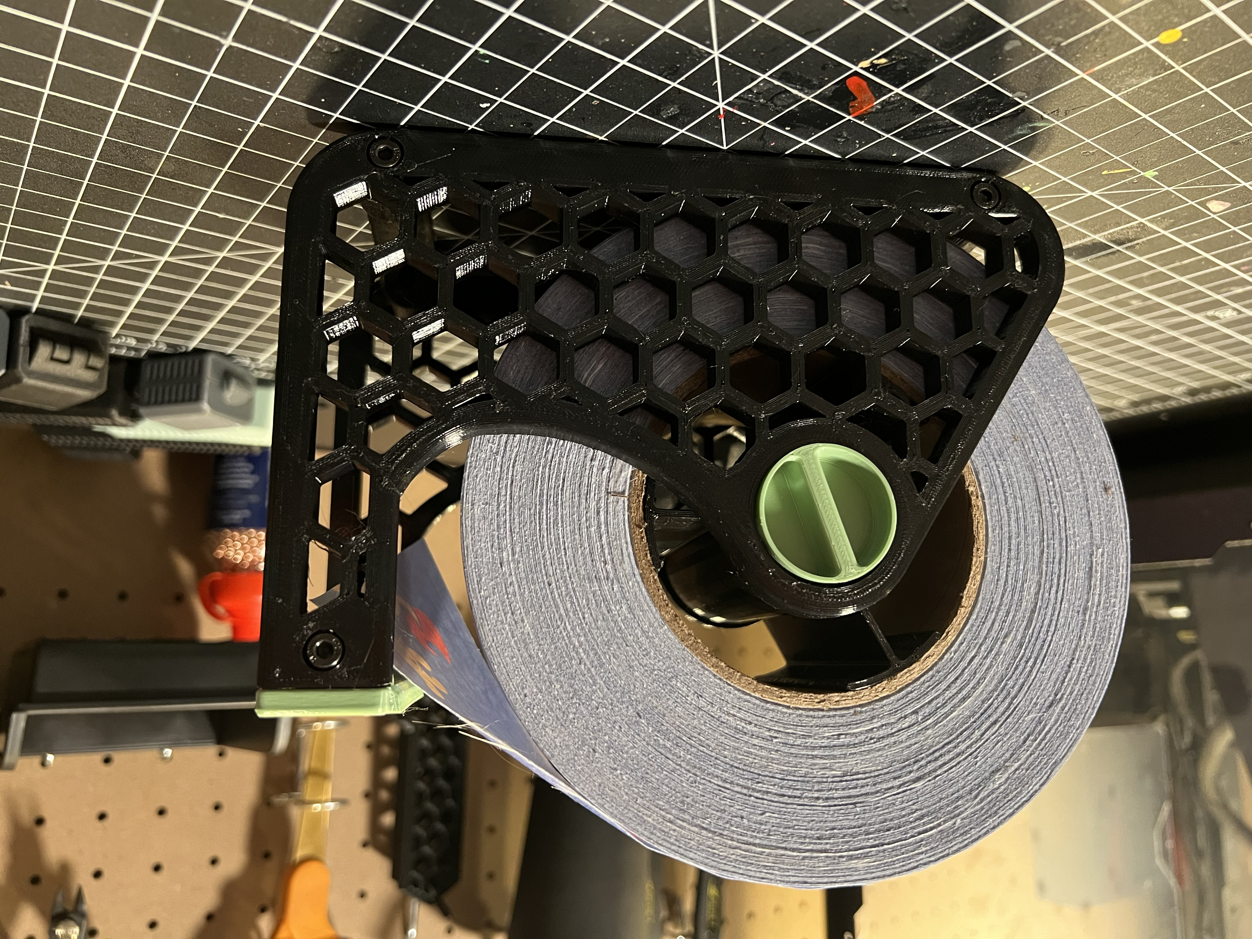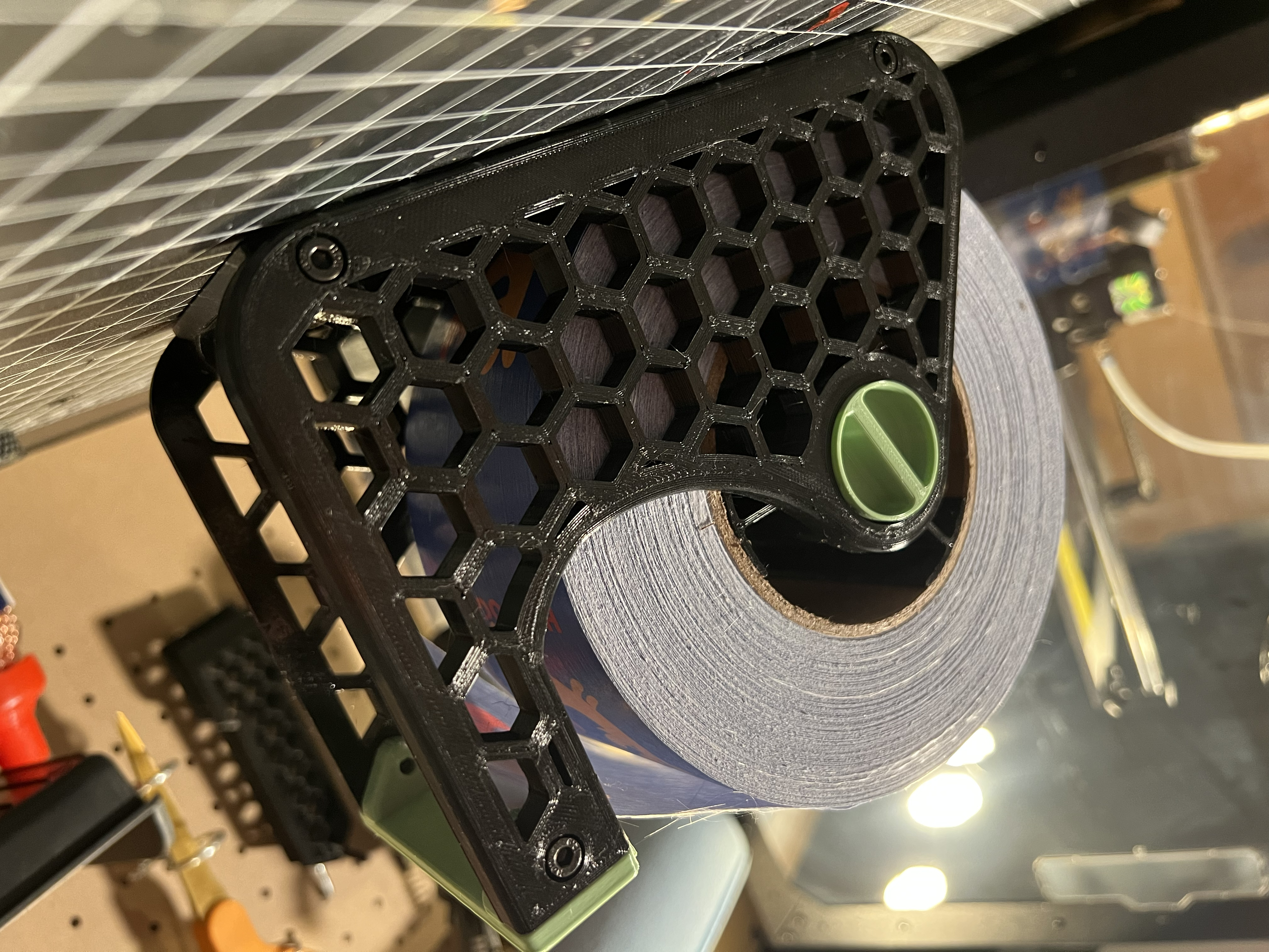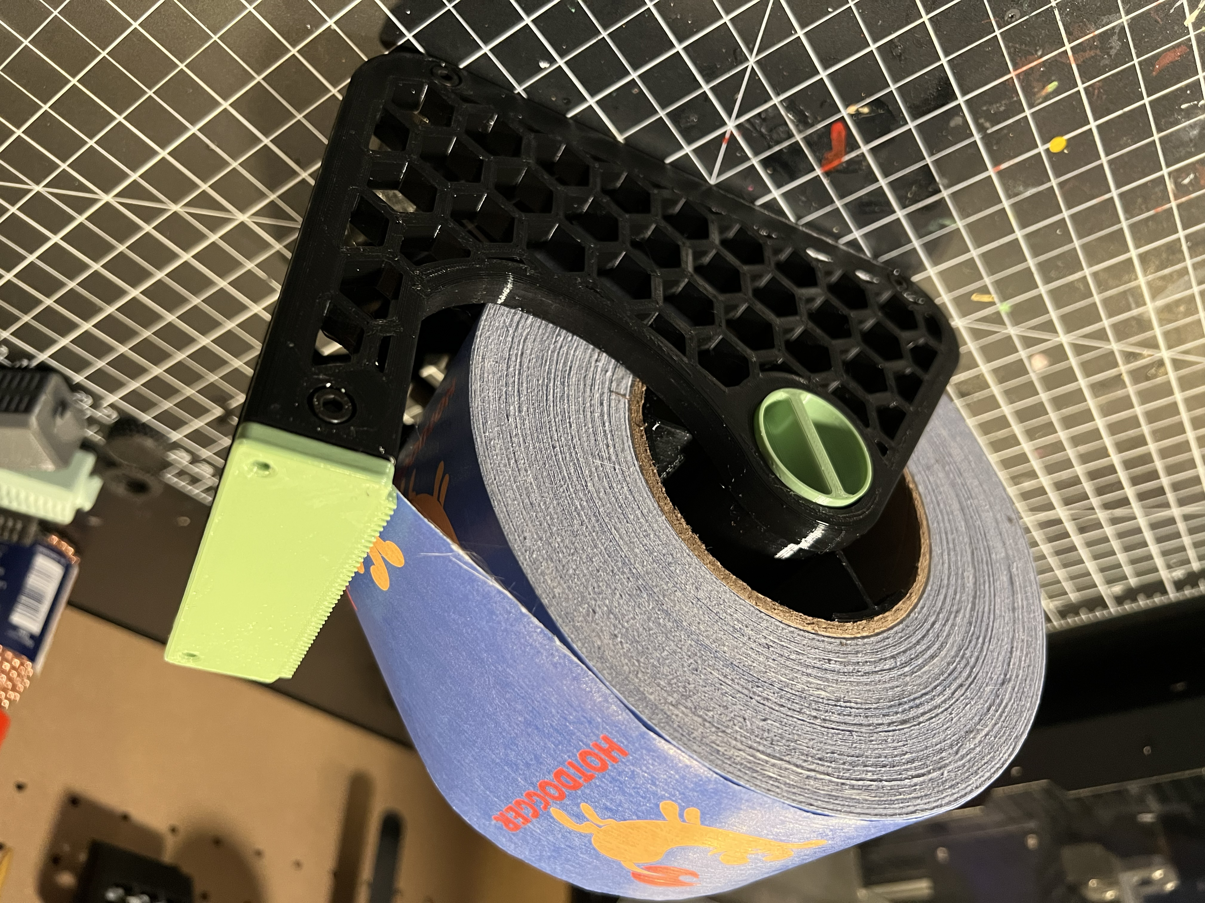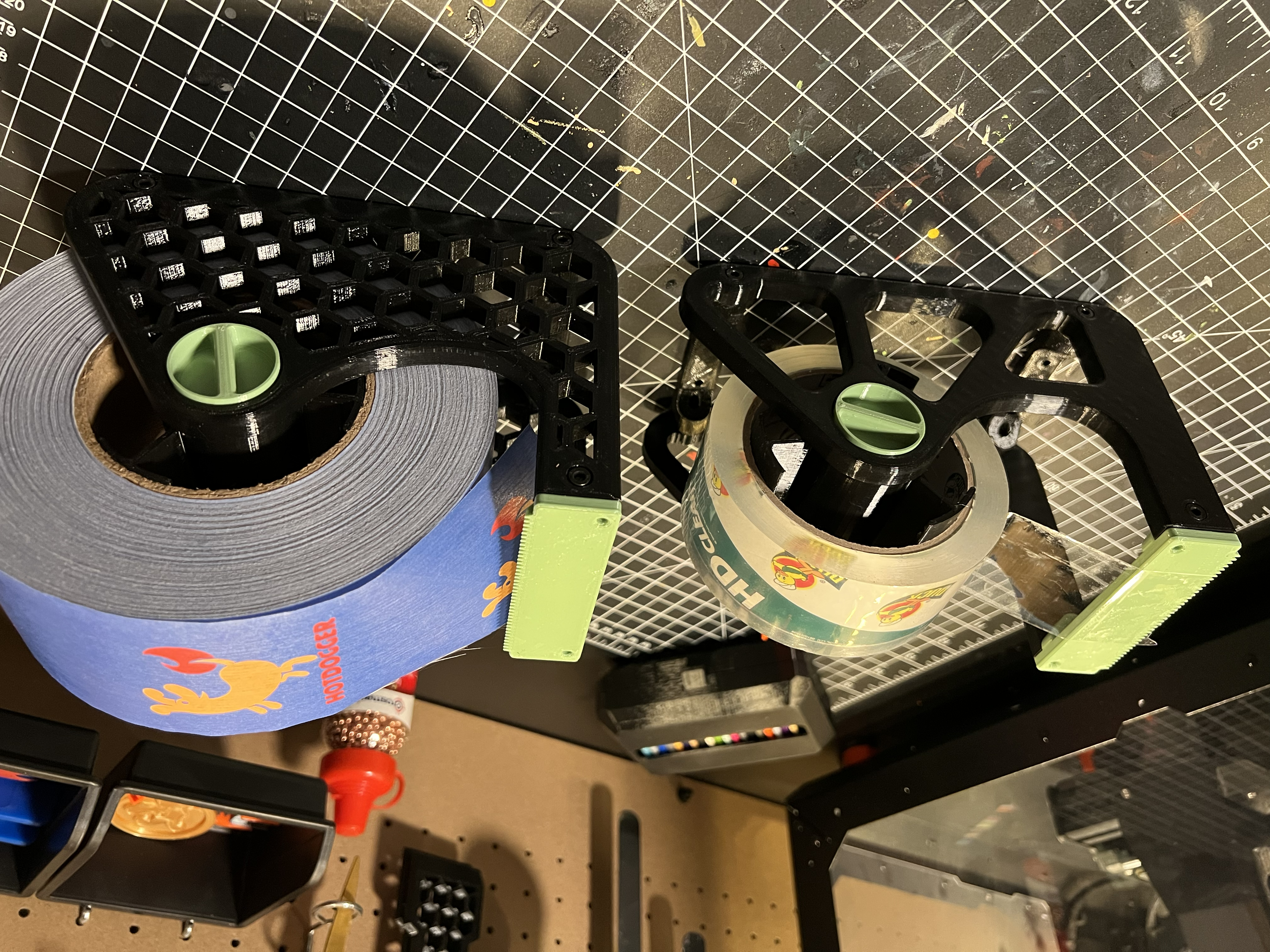 Cần giữ cuộn băng keo bự chà bá? Đừng tìm đâu xa. Đây là các cạnh "Honeycomb Dispenser Sides" được chỉnh sửa để xài cho các cuộn băng keo lớn hơn 6.5 inch, kết hợp với bộ phận bên trong của mẫu gốc từ tetralite.