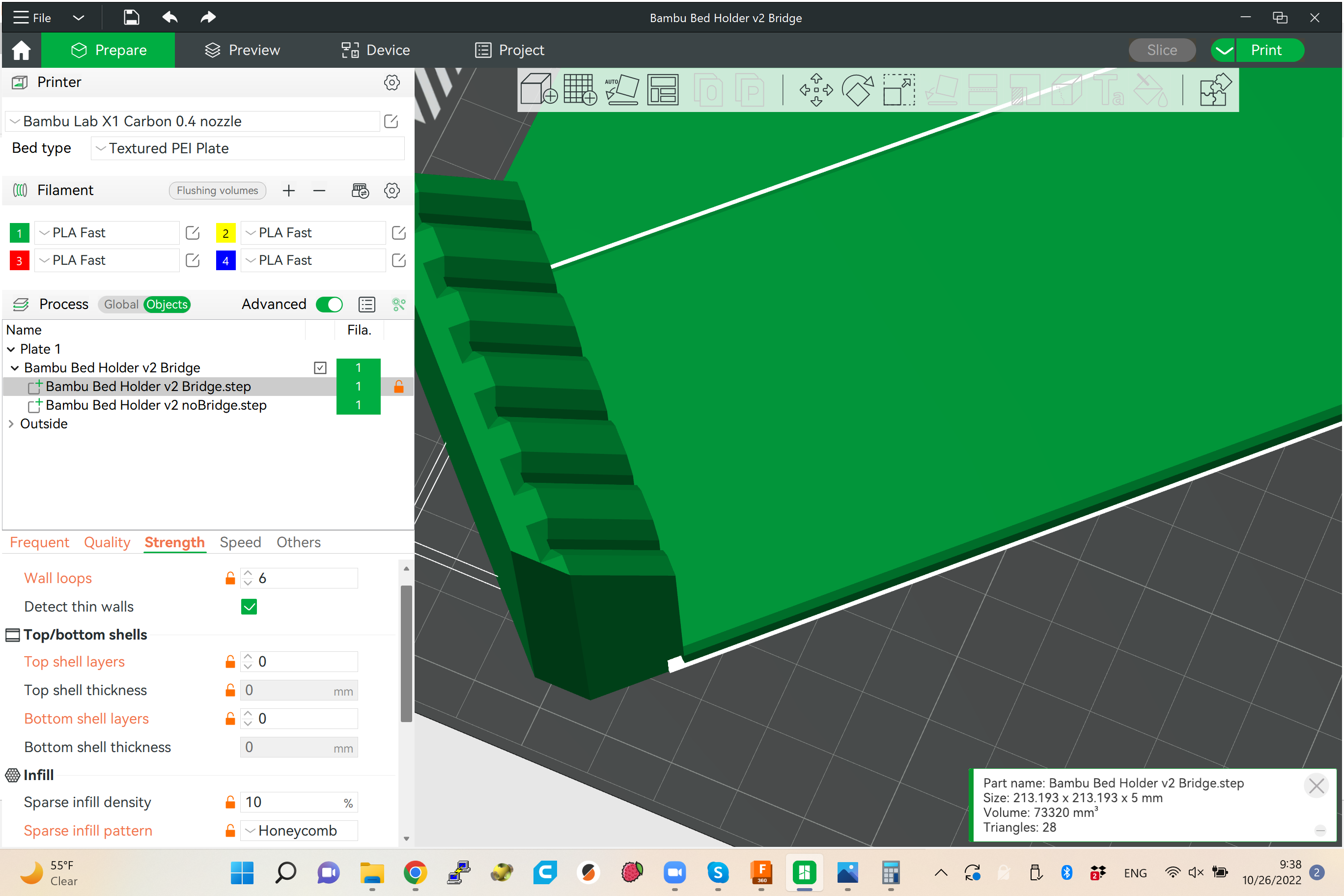Trên Bambu Lab X1 (Carbon), các phiên bản lớn hơn (nhiều khe hơn) hầu như không vừa, vì vậy bạn sẽ cần xoay 135 (hoặc 315) độ trên trục Z và tắt Hiệu chuẩn Dòng chảy khi gửi bản in, nếu không các đường dòng chảy sẽ bị dính vào đáy của mô hình.