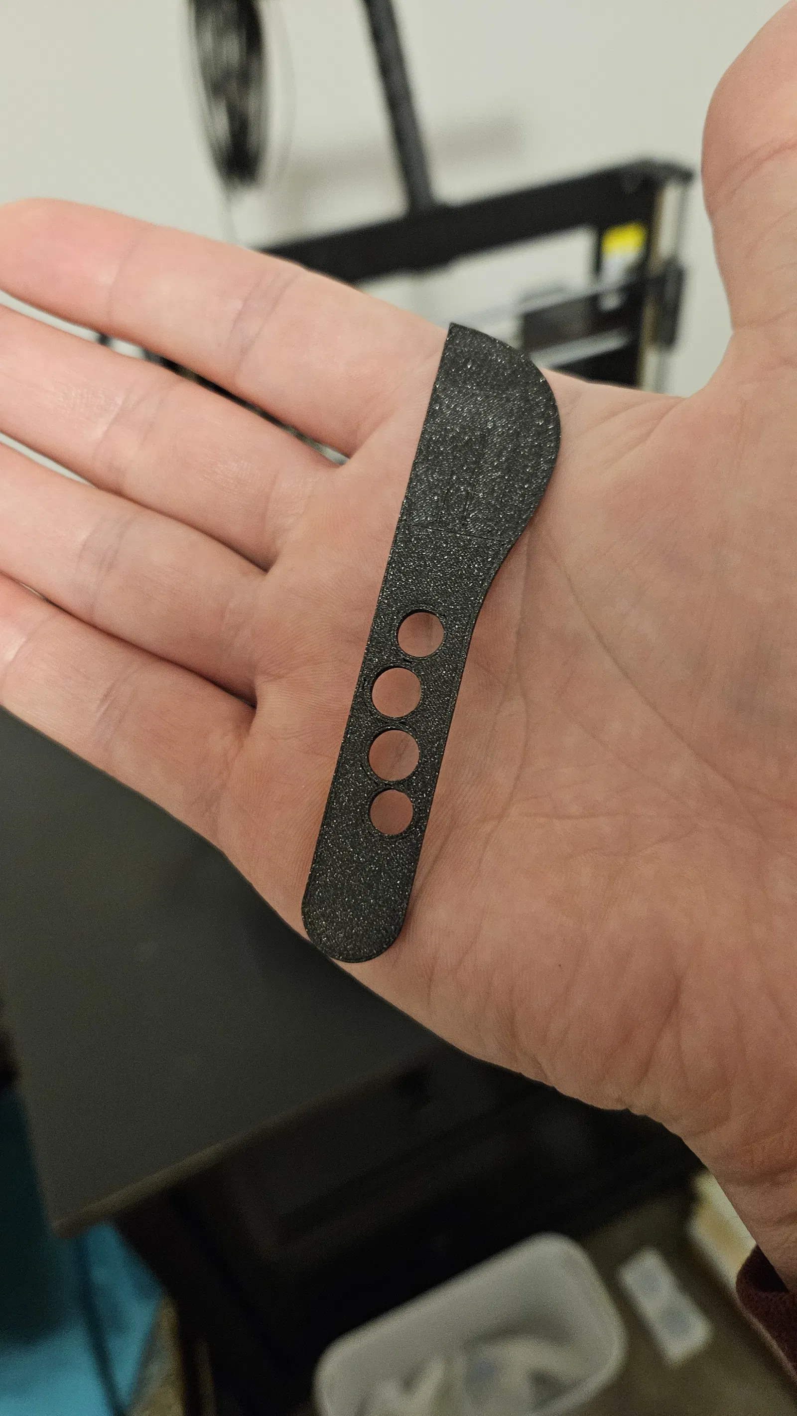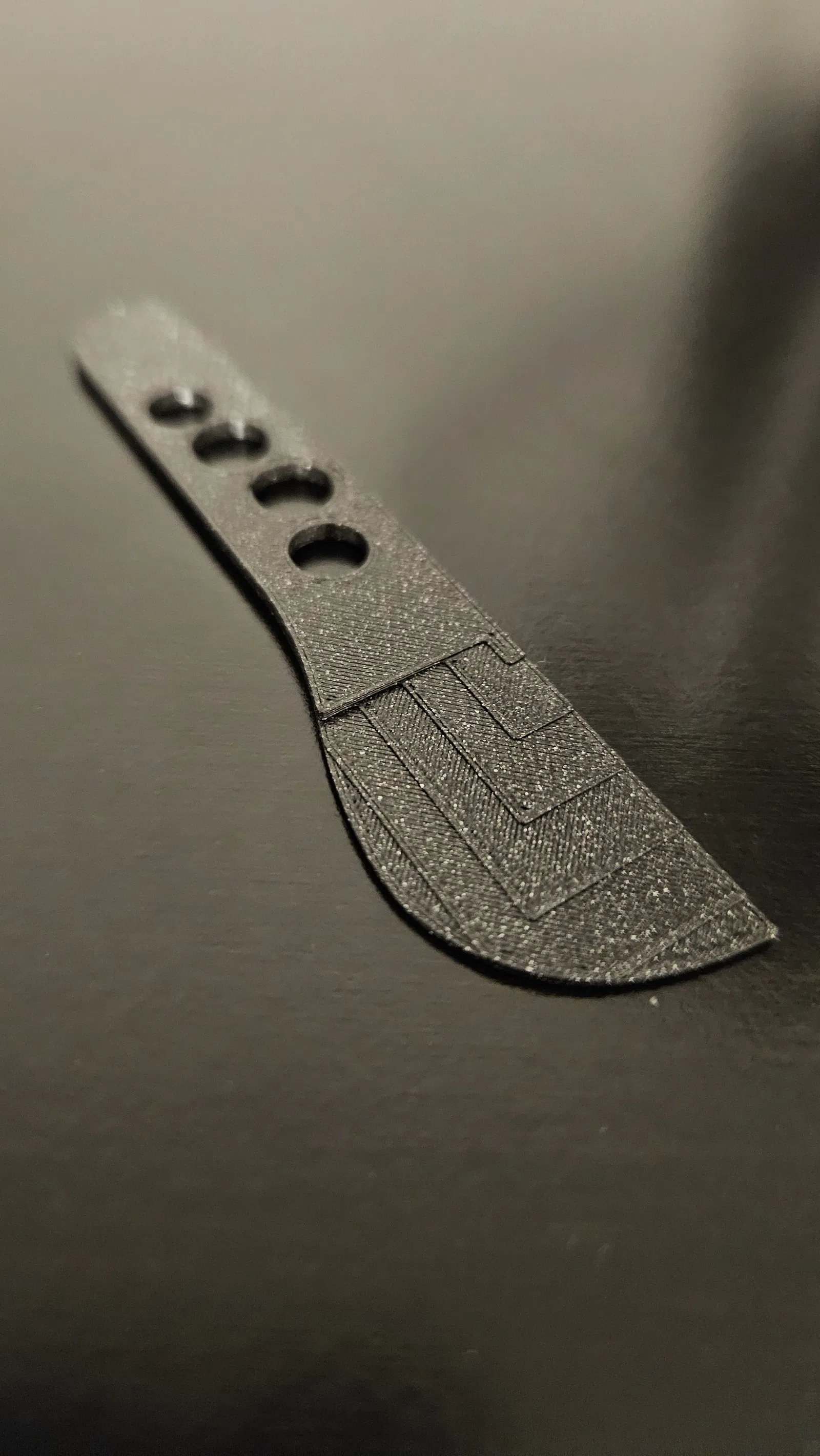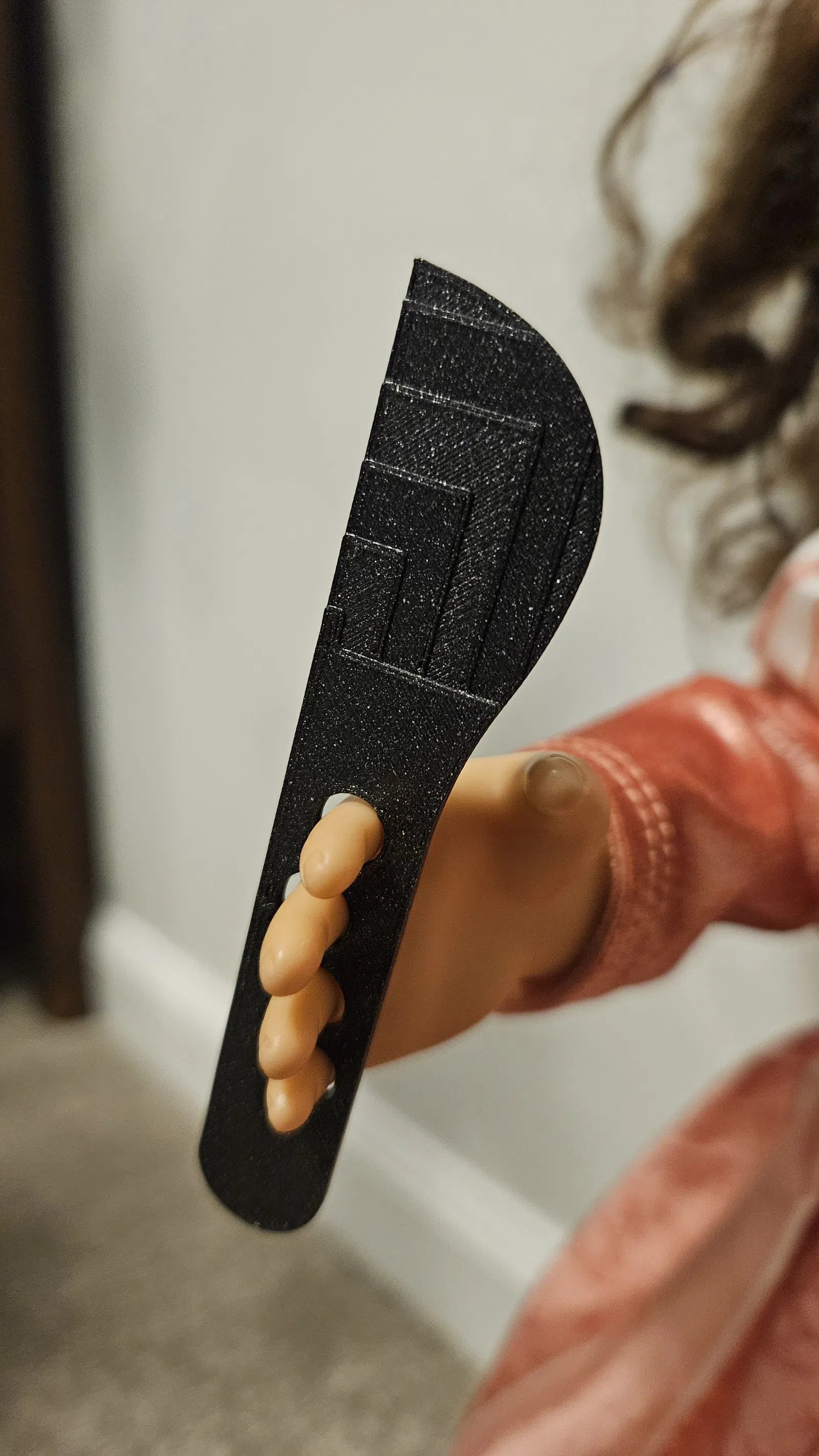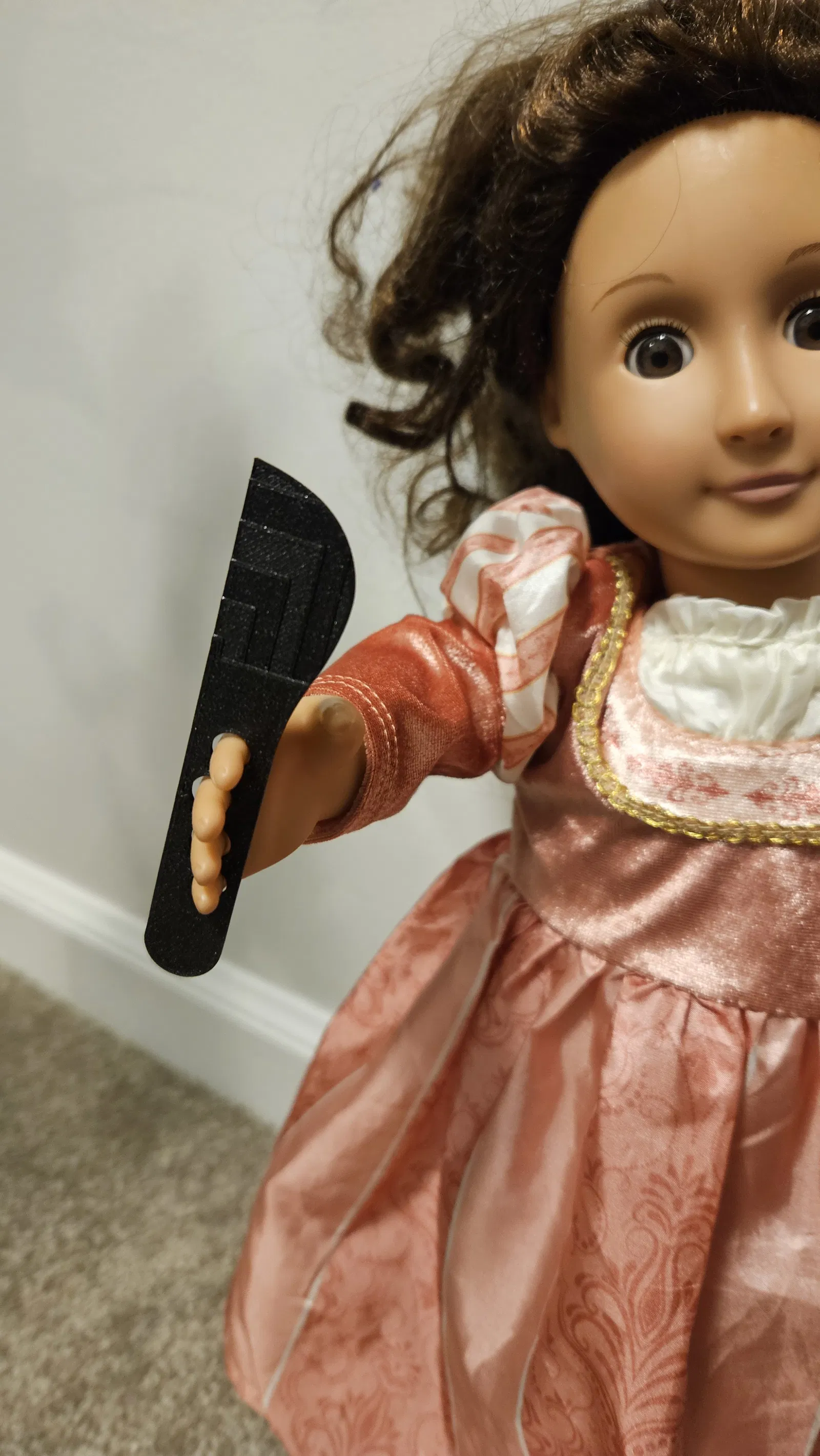 Dao đồ chơi cho búp bê Our Generation (18-inch/46-cm). Dao có thể cầm bằng ngón tay và cả hai tay. Kích thước 9x2x2 cm, in bằng PLA. Xem thêm các mẫu nĩa, muỗng và ngôi sao ném liên quan.