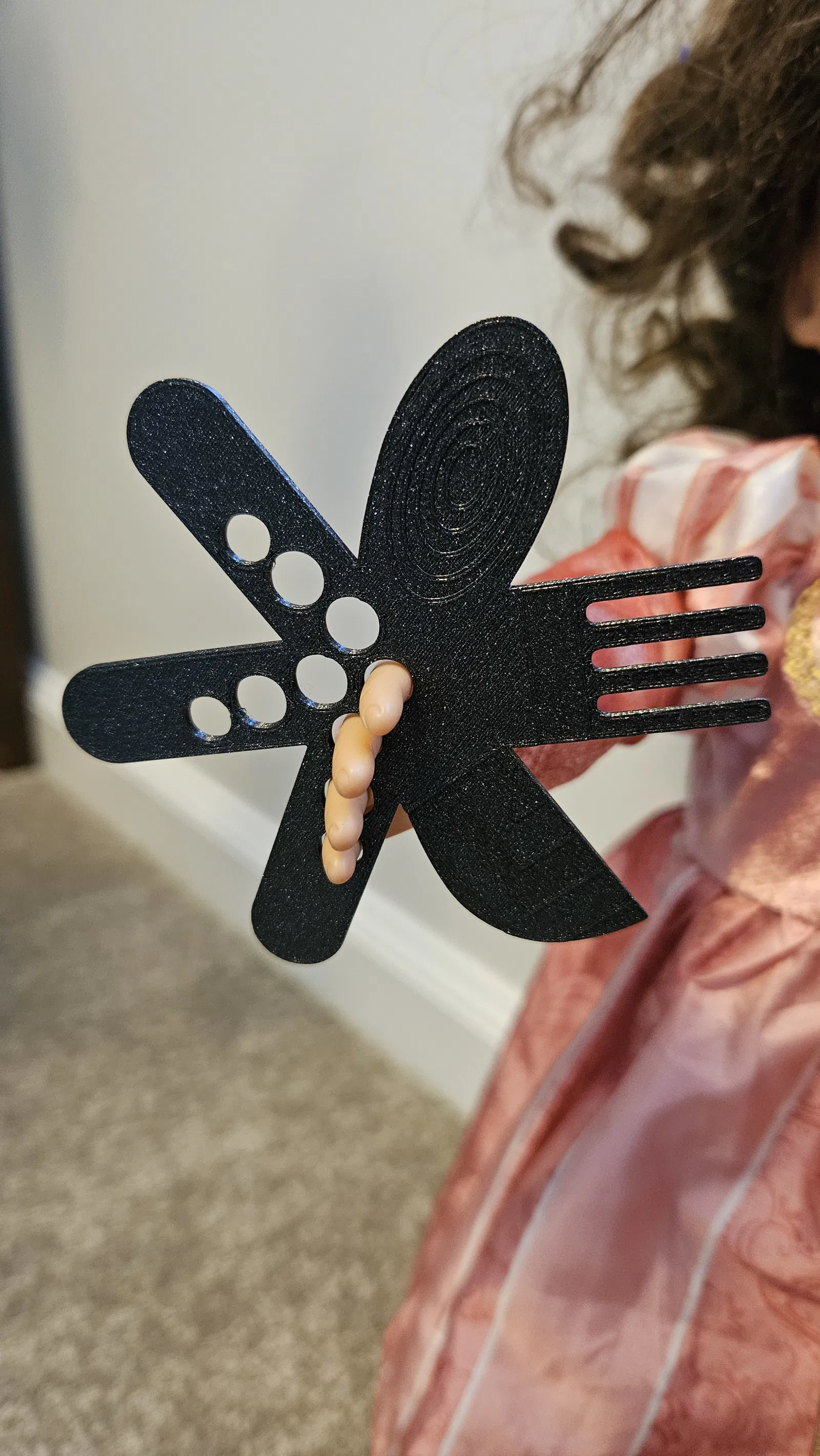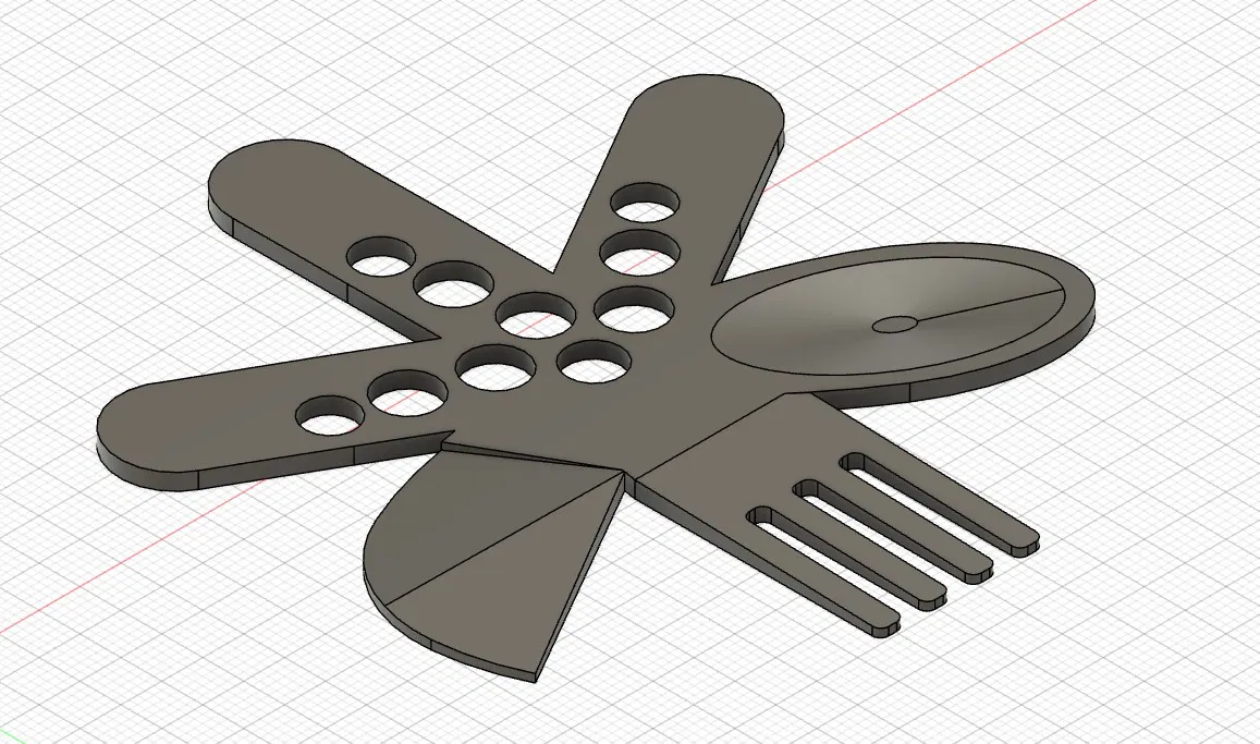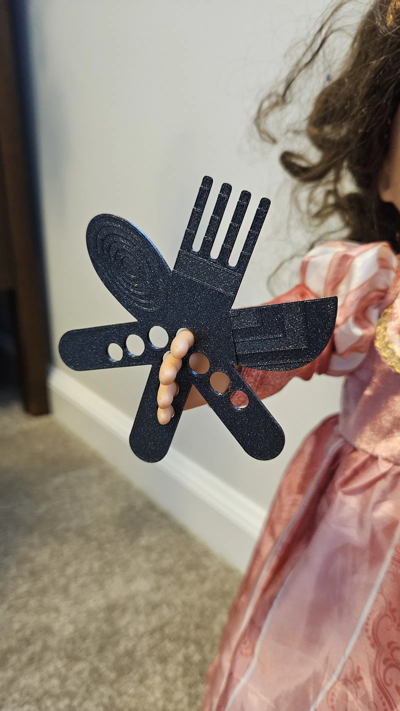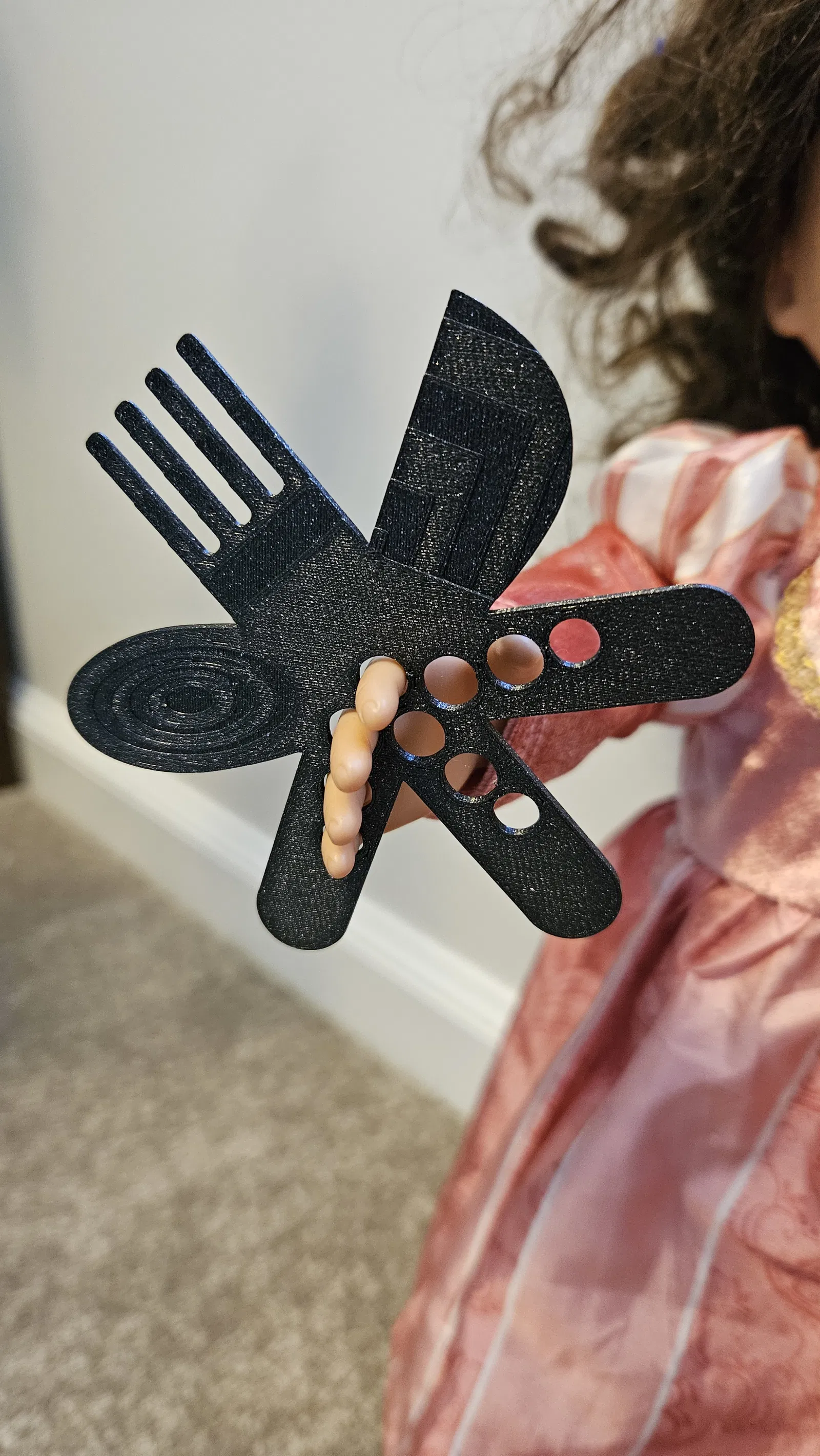 Ngôi sao ném Dao-Muỗng-Nĩa này dành cho búp bê Our Generation. Có thể cầm bằng ngón tay theo 3 kiểu khác nhau ở cả hai tay. Búp bê có thể dùng để ăn, chải tóc, hay chiến đấu. Kích thước 9x9x2 mm, cân bằng hoàn hảo, in bằng PLA galaxy black.