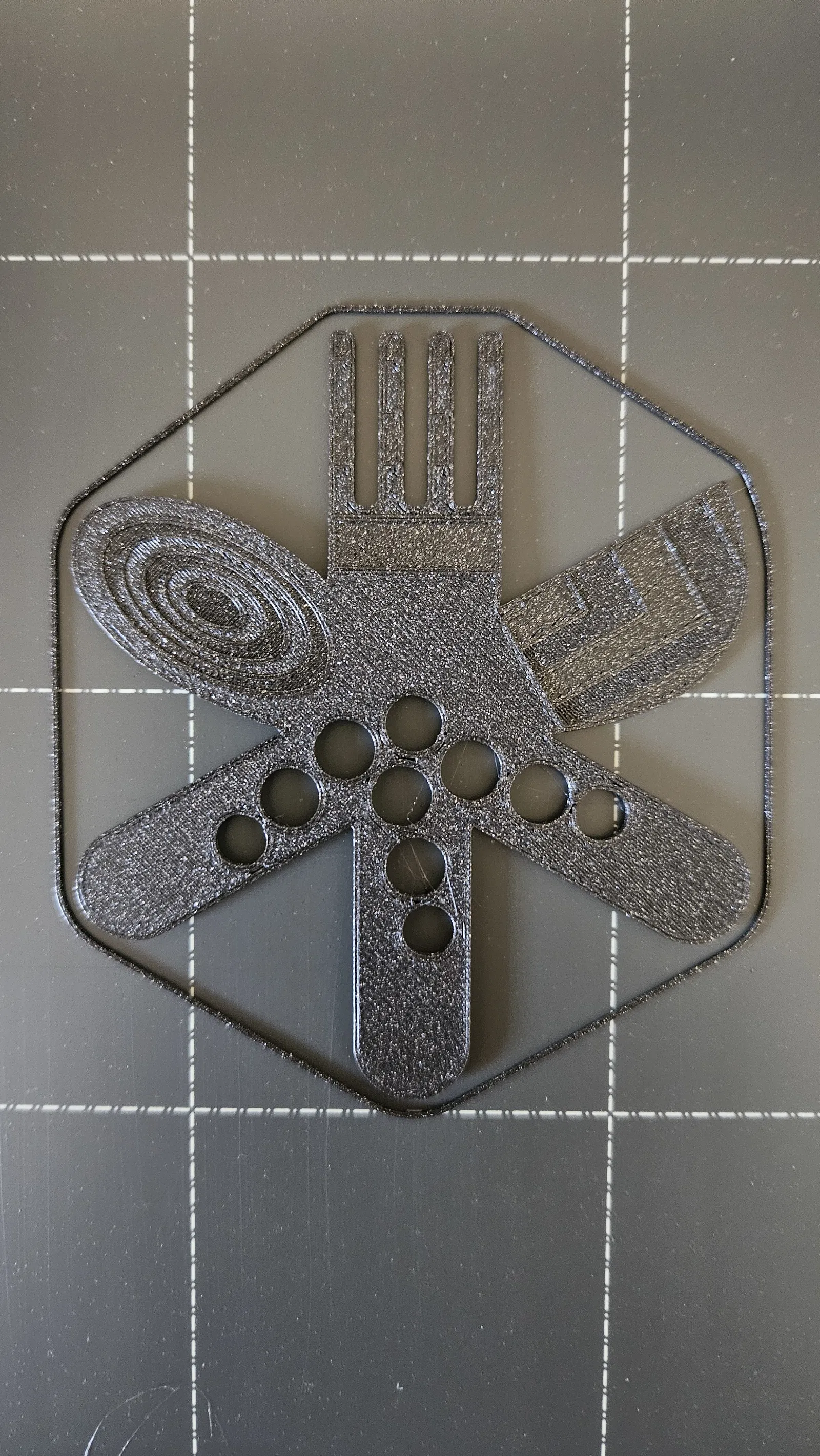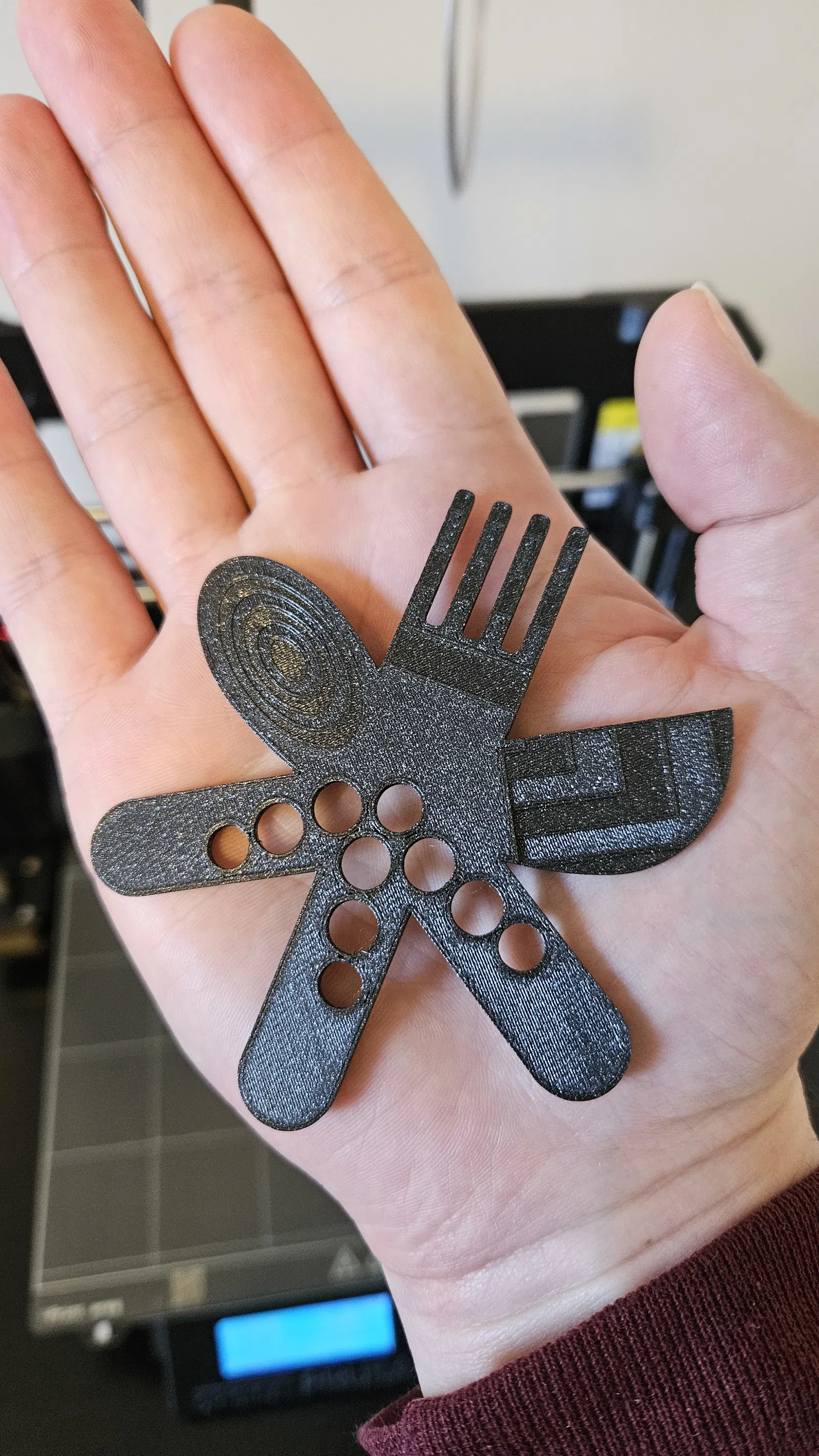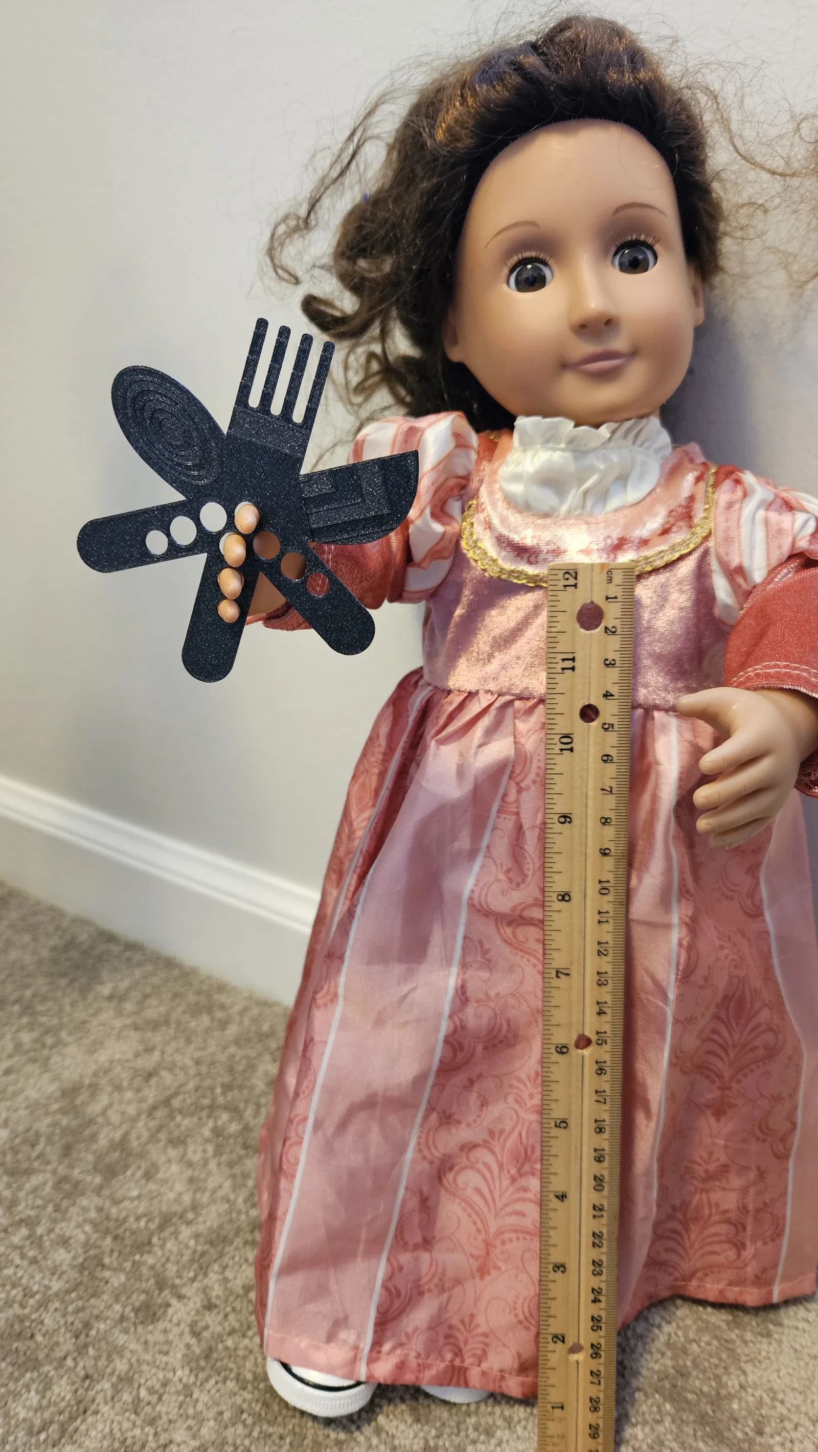 Ngôi sao ném Dao-Muỗng-Nĩa này dành cho búp bê Our Generation. Có thể cầm bằng ngón tay theo 3 kiểu khác nhau ở cả hai tay. Búp bê có thể dùng để ăn, chải tóc, hay chiến đấu. Kích thước 9x9x2 mm, cân bằng hoàn hảo, in bằng PLA galaxy black.