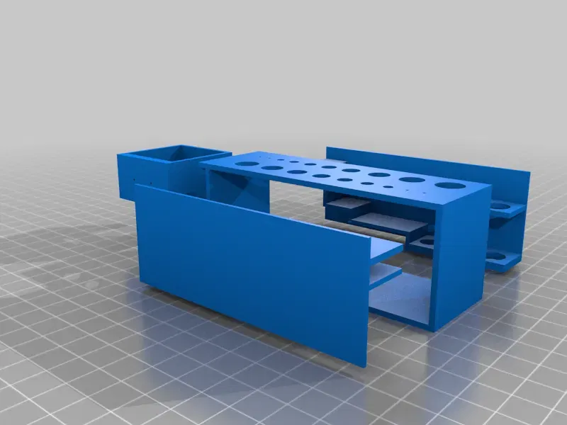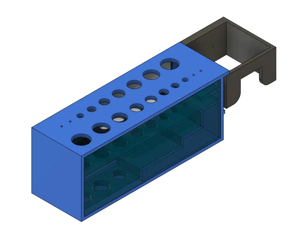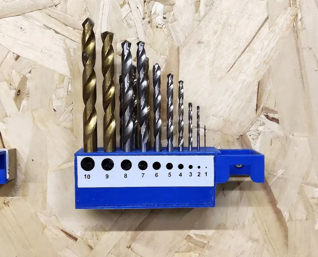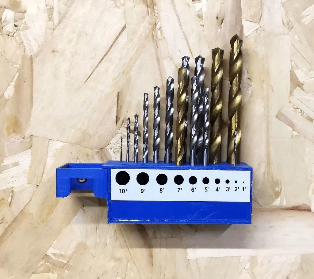 Contenitore treo tường cho các mũi khoan, cái chứa này có thể tách ra khỏi giá đỡ để mang đi nơi cần thiết và được chia thành hai bên, một bên chứa các mũi với kích thước nguyên và bên còn lại là các kích thước nửa.