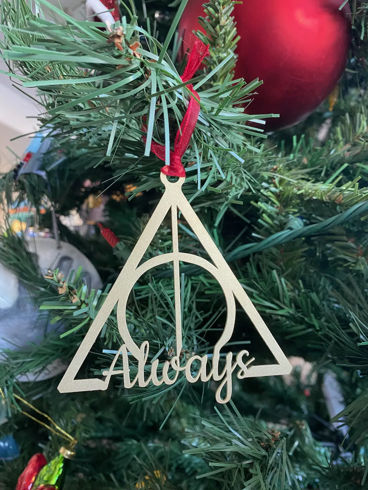Móc treo "Harry Potter, Bảo bối Tử thần" này được in bằng PLA với độ dày vật liệu độn bên trong từ 10% - 15% và không yêu cầu đế đỡ. Phù hợp để trang trí Giáng sinh hoặc làm quà tặng cho fan Harry Potter.