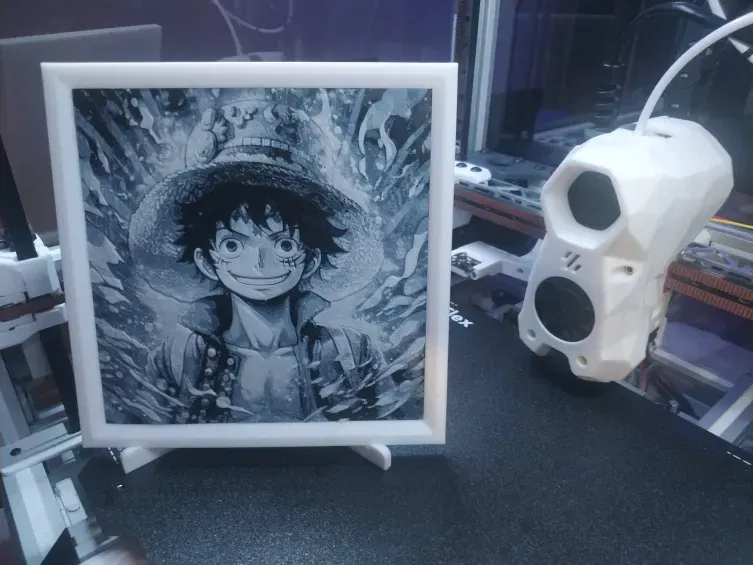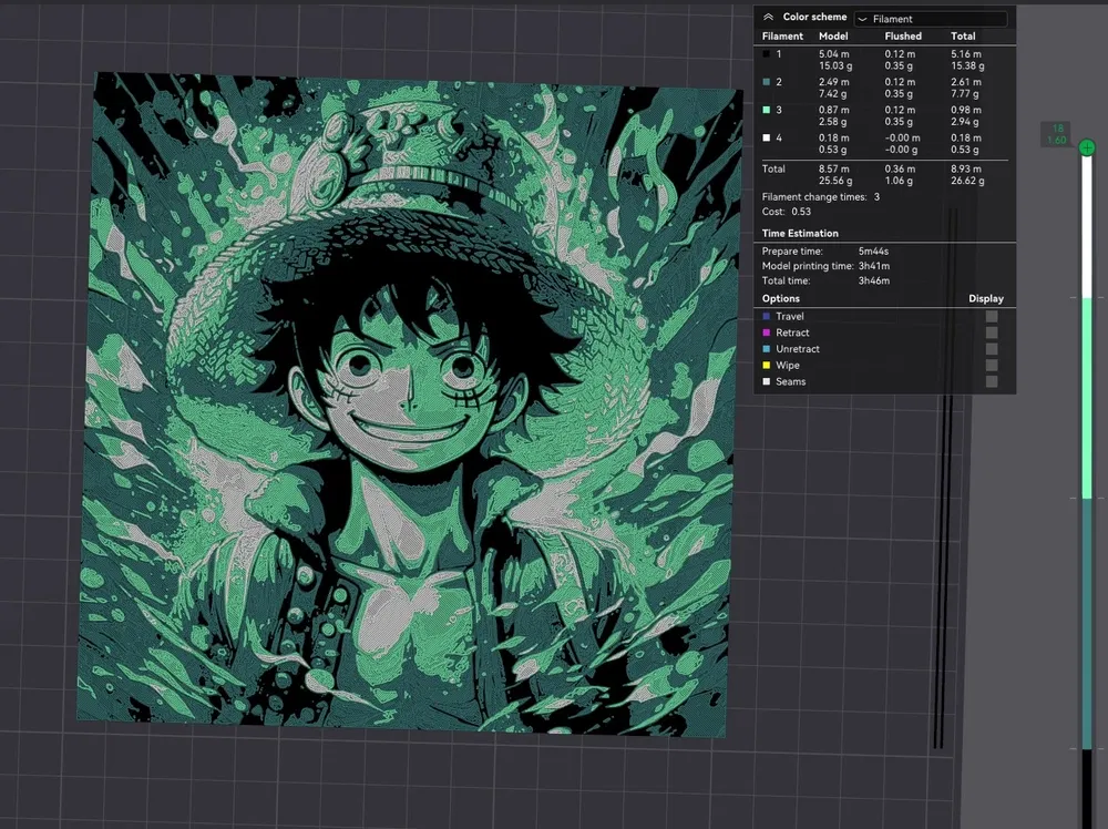 In tranh với 100% độ đặc ruột, độ cao lớp in 0.08mm và lớp nền 0.24mm. Hướng dẫn đổi màu sợi nhựa: Bắt đầu với màu Đen.