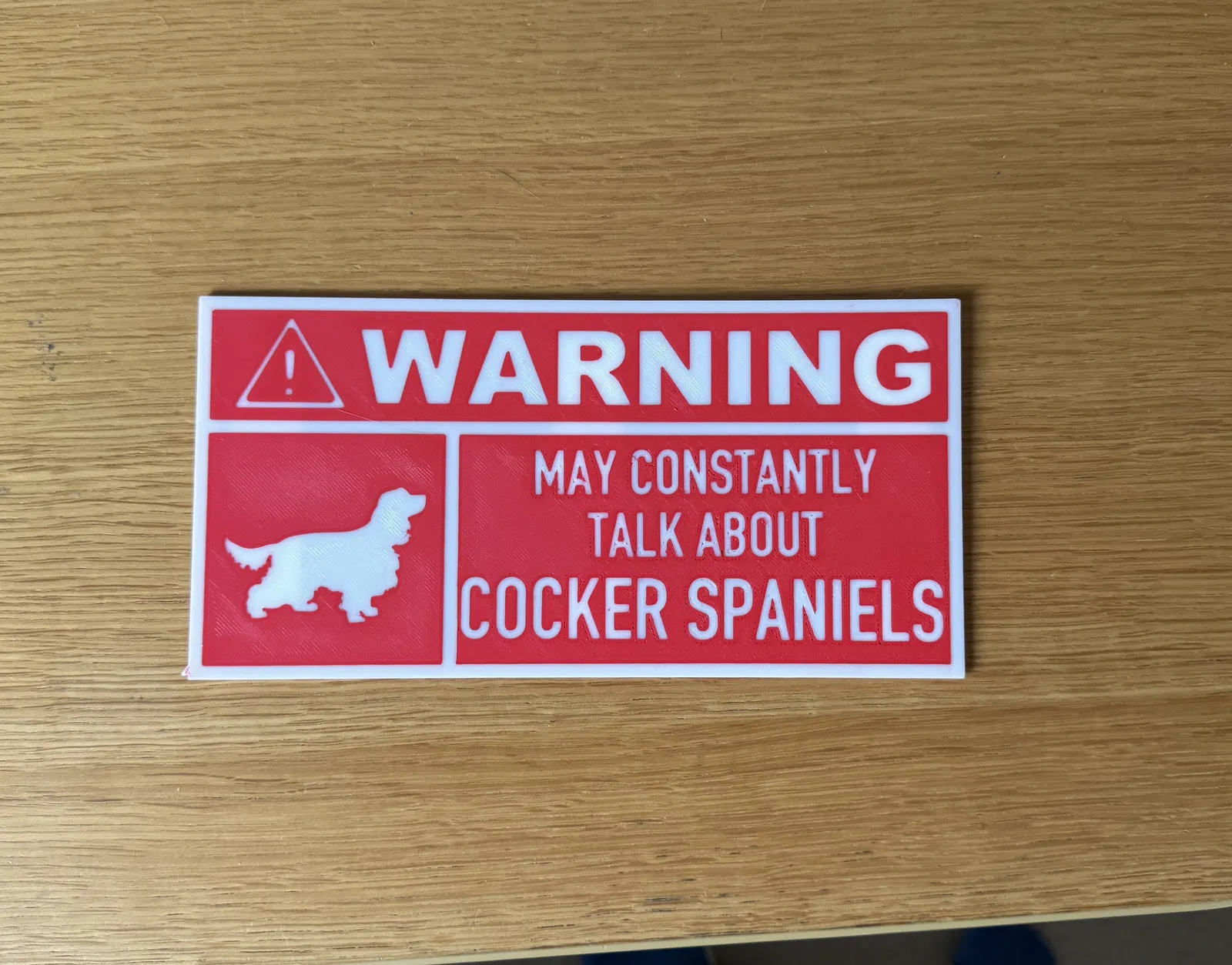Một tấm biển vui nhộn dành cho bạn bè của bạn, những người phát cuồng vì giống chó Cocker Spaniel. Thích hợp để in 3D bằng PLA hoặc các vật liệu khác.