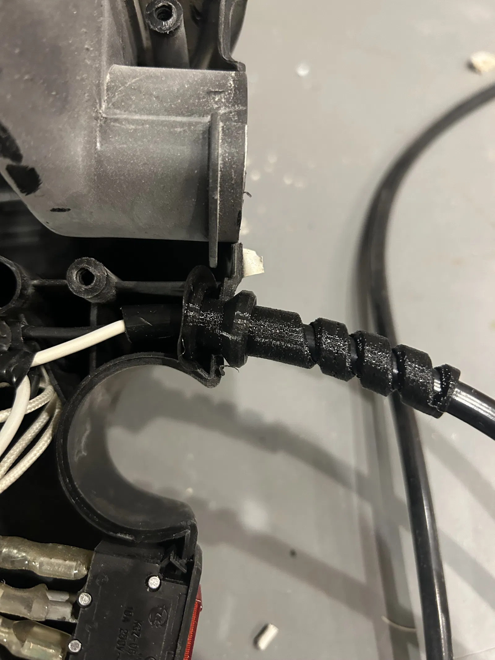 Cái dây nguồn của cái máy hút bụi rẻ tiền ở Harbor Freight nó bị gãy, làm đứt luôn dây điện ngay chỗ ra khỏi máy. Mình in bằng nhựa ninjaTec Cheetah.