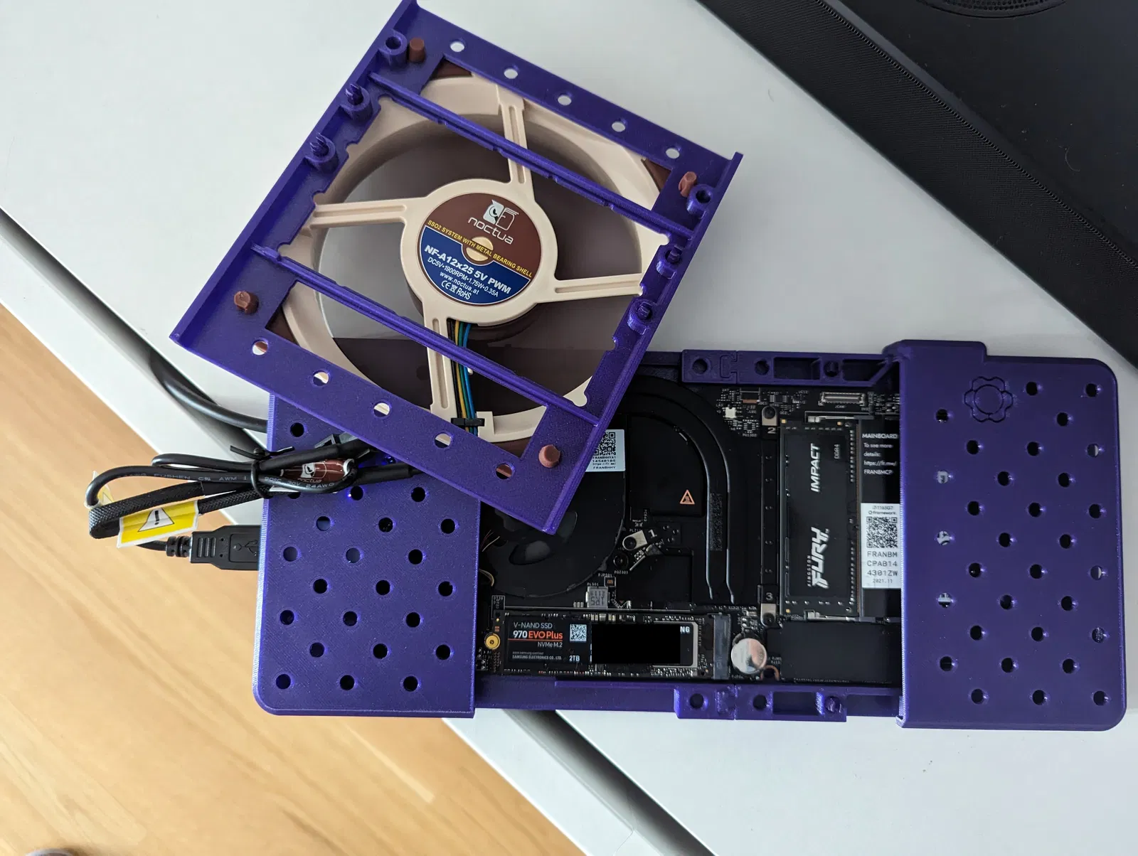 Bản phối lại vỏ bo mạch chủ Framework 13 với khe cắt cho quạt 120mm. Dùng quạt Noctua NF-A12x25 5V PWM, giúp giảm nhiệt độ CPU Intel Gen 11 hơn 10 độ C. Lắp đặt dễ dàng với đế chống rung silicon.