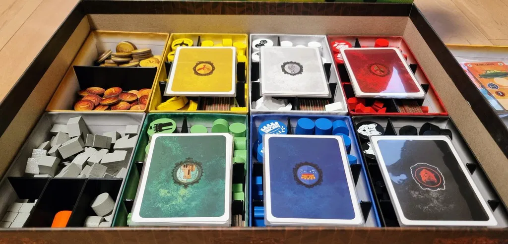 Bộ sắp xếp cho trò chơi cờ bàn La Famiglia, vừa vặn trong hộp giấy. Giúp thiết lập nhanh chóng và tiết kiệm filament (~140g). In 6 khay người chơi, khay trung lập và khay tiền xu.