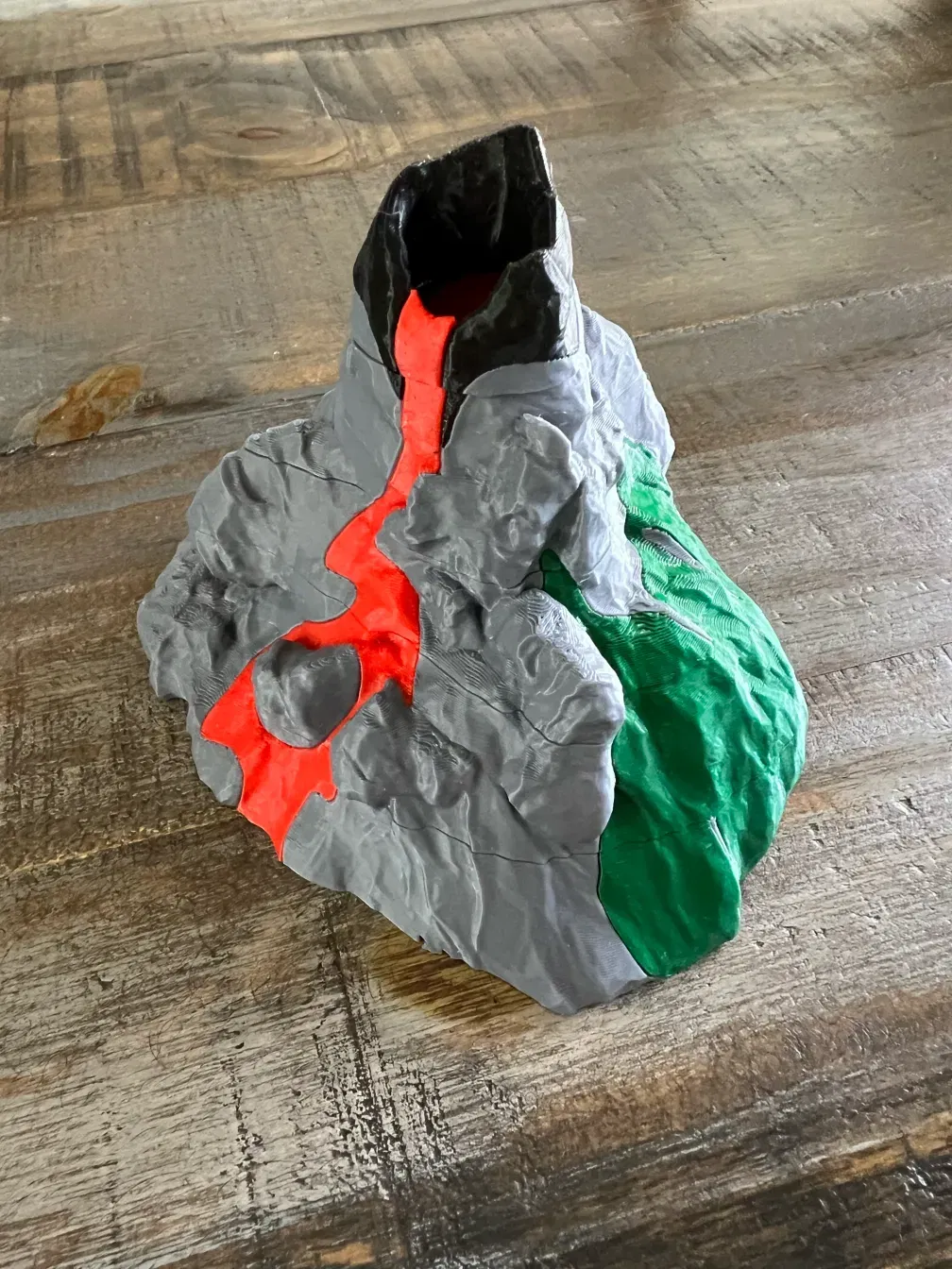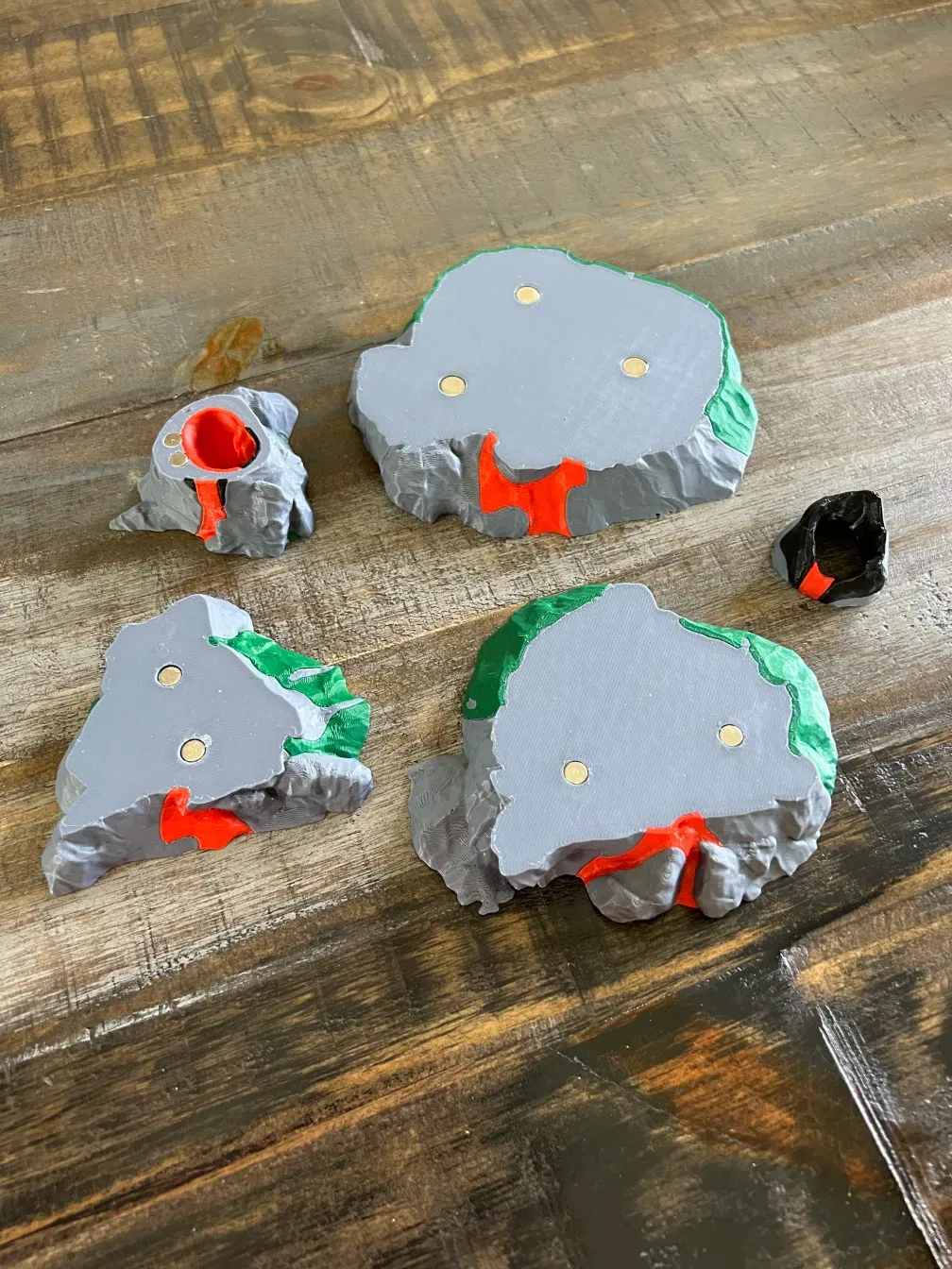 Tôi đã kéo dài mô hình cao hơn, sử dụng Meshmixer để tô màu cho dung nham, thực vật, đá và đá cháy. Cắt bỏ 10~15% phần dưới để loại bỏ phần nhô ra, chia thành năm mảnh, và thêm lỗ cho nam châm. Mỗi mảnh cần phải < 27mm cao để vừa vặn trong hộp trò chơi gốc.