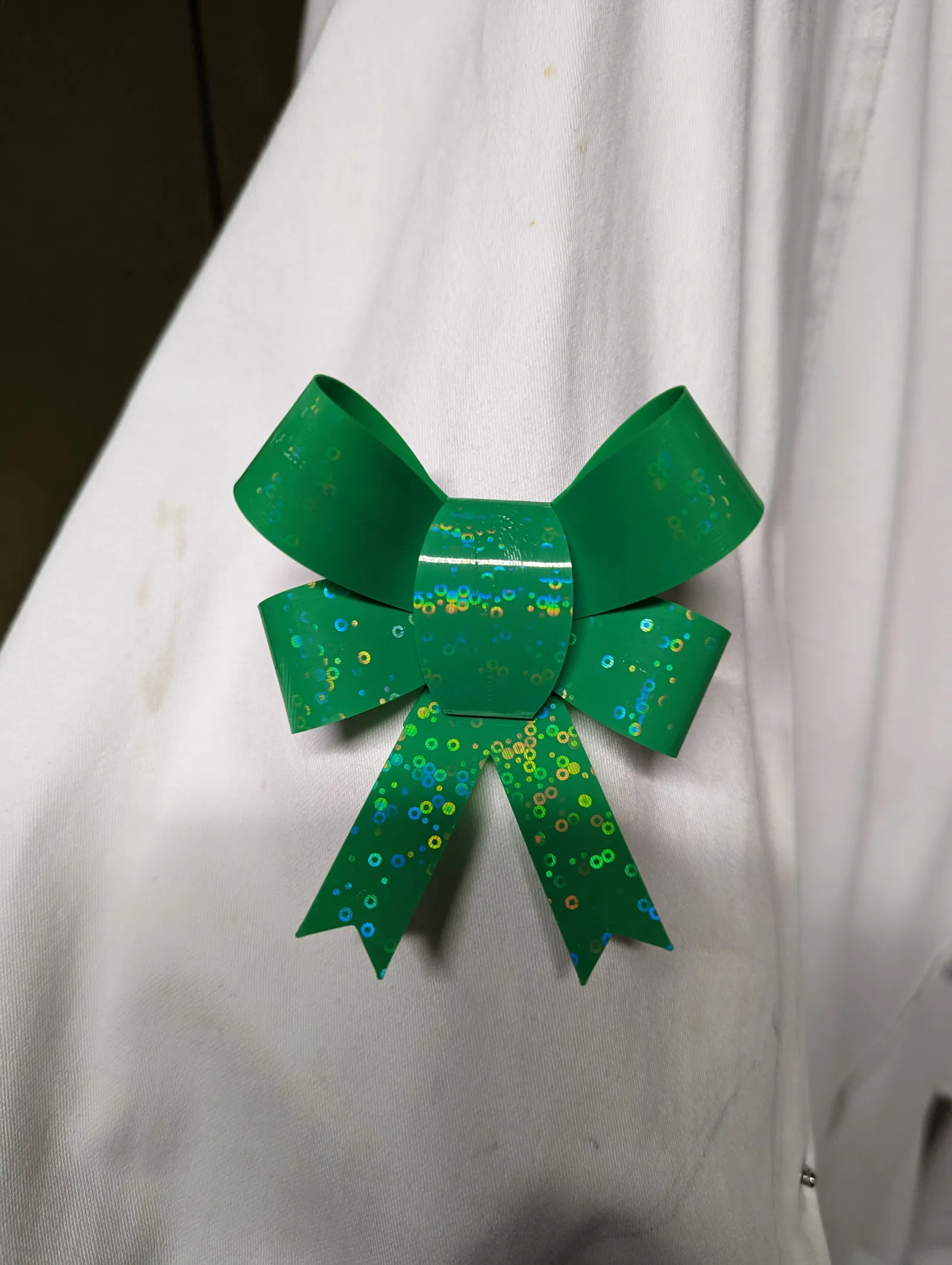 Chỉnh sửa nơ Giáng Sinh, cho phép hiển thị dấu in trên toàn bộ mặt trước của nơ. Thêm lỗ để buộc hoặc cài, và tăng chiều dài ghim để thêm lớp. Sử dụng cài đặt in được đề xuất.