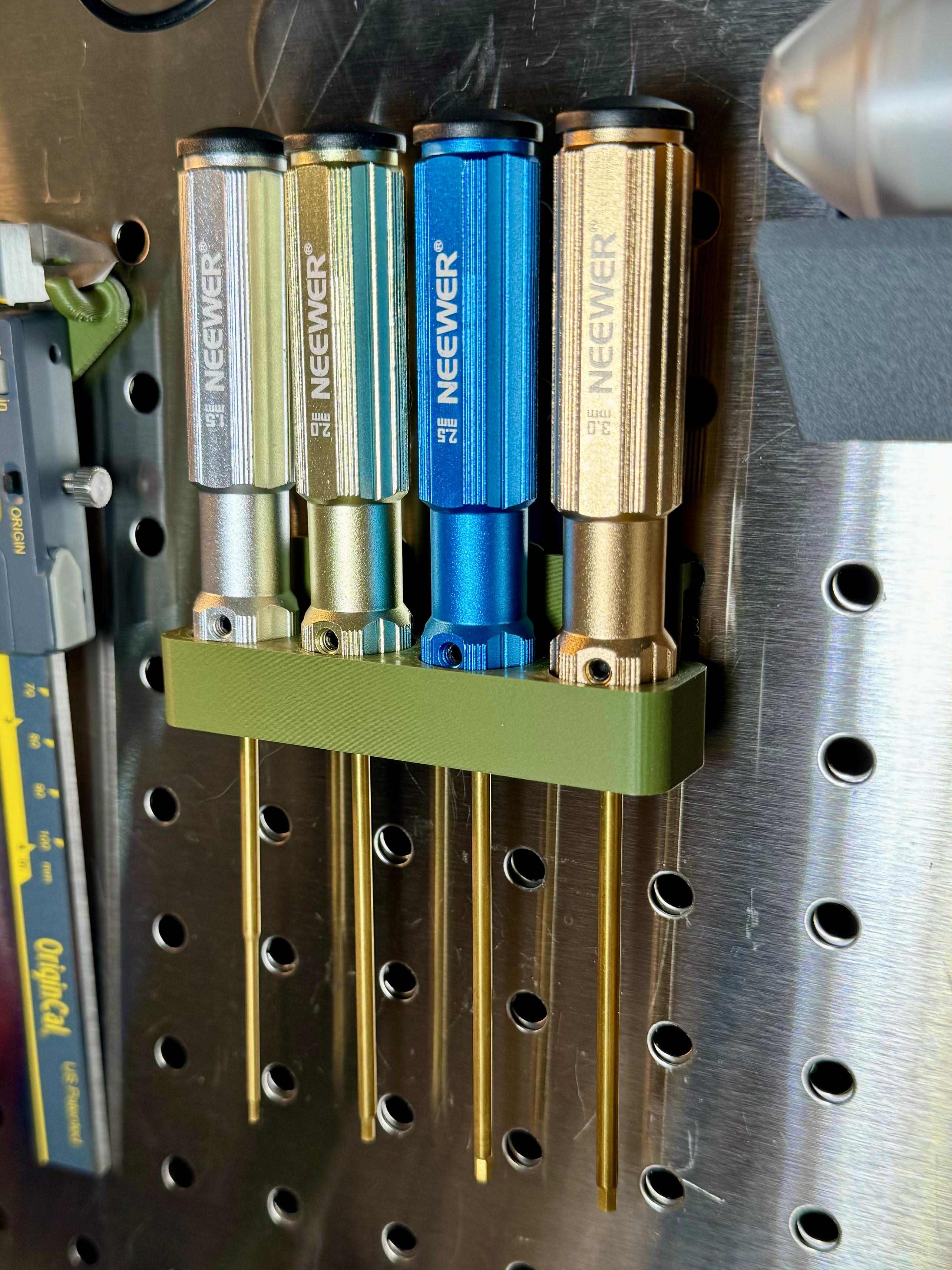 Cái bản gốc không vừa với pegboard nên tui đã chỉnh sửa lại phần chốt. Mẫu này là giá đỡ cho tuýp lục giác, được thiết kế để gắn vừa vặn vào pegboard tiêu chuẩn. Nếu bạn gặp vấn đề tương tự với các mẫu có sẵn, bản chỉnh sửa này sẽ giải quyết được. In bằng PLA, file STL có sẵn.