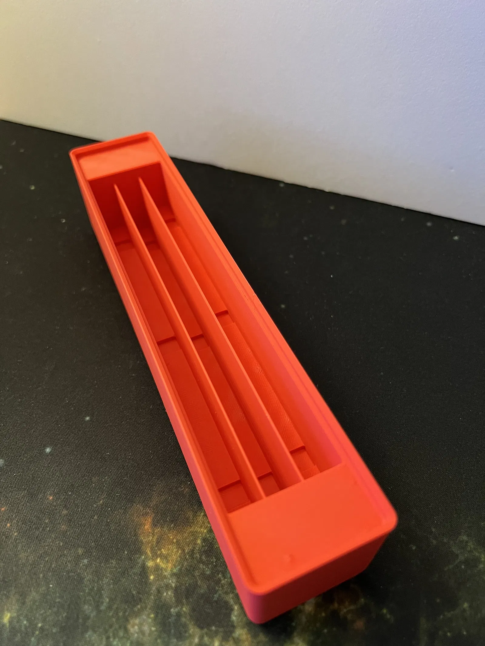 Tui dùng cái con dấu để in cái hình dạng mấy cái breadboard lên cái hộp gridfinity 1x5. Vừa đủ chỗ để nhét ba cái breadboard nằm kế bên nhau luôn. Có mấy cái rãnh khoét sẵn để mình gắn cái board theo chiều nào cũng được hết trơn á. Chiều cao mỗi cái board cũng khác nhau để dễ lấy ra lắm.