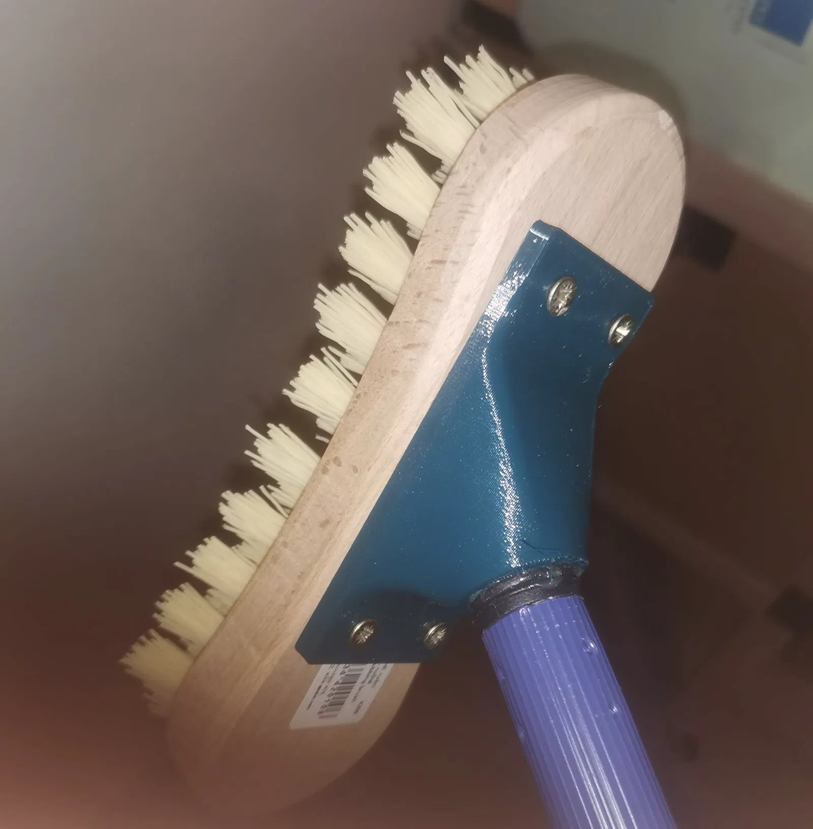 Mấy cái bàn chải gắn vô cây gậy lau nhà đều vuông góc với hướng mình di chuyển để lau chùi hết, nên tui tự chế cái này. Nó nhận ren 22mm của cây nối chổi và bốn con vít gỗ 4mm. Cái lỗ ở giữa có thể dùng để cố định cây gỗ từ dưới lên nha.