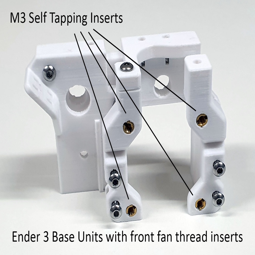 Đã tải lên các bộ phận đế bổ sung với sửa đổi cho phép sử dụng các đầu ren vít tự khai thác M3 bằng đồng thau thay vì các lỗ dẫn hướng tiêu chuẩn. Nếu bạn dự định tháo quạt phía trước thường xuyên, việc định vị trên ren thay vì làm mòn lỗ dẫn hướng sẽ mang lại độ bền cao hơn. Tất cả các tệp có đầu ren ở cuối nhãn. Các đầu ren chỉ dành cho quạt hướng về phía trước chứ không phải cho tất cả các đầu ren. Phần lớn các chi tiết cố định là loại M3 Nyloc. Liên kết đến các đầu ren được sử dụng trên Amazon UK: https://www.amazon.co.uk/gp/product/B07D1L36RM/ref=ppx_yo_dt_b_asin_title_o06_s00?ie=UTF8&psc=1