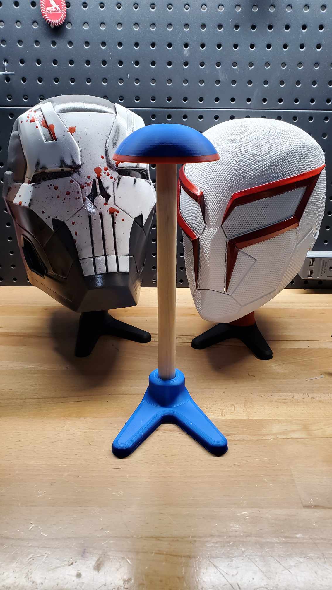Giá đỡ mũ bảo hiểm chi phí thấp, rất đơn giản (nhưng hiệu quả), được thiết kế để sử dụng với thanh đường kính 20mm. Thanh này có thể được in hoặc mua. Thanh tôi dùng là từ Hobby Lobby, và tôi có thể làm ra 3 giá đỡ mũ bảo hiểm từ một thanh dài 1m (khoảng 2 đô).
