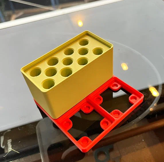 Cái này là cái kệ đựng bút chì đủ loại, đường kính từ 9mm tới 13mm luôn nha. Cái kệ này được thiết kế bởi cái plugin Fusion 360 đó, xịn sò lắm!