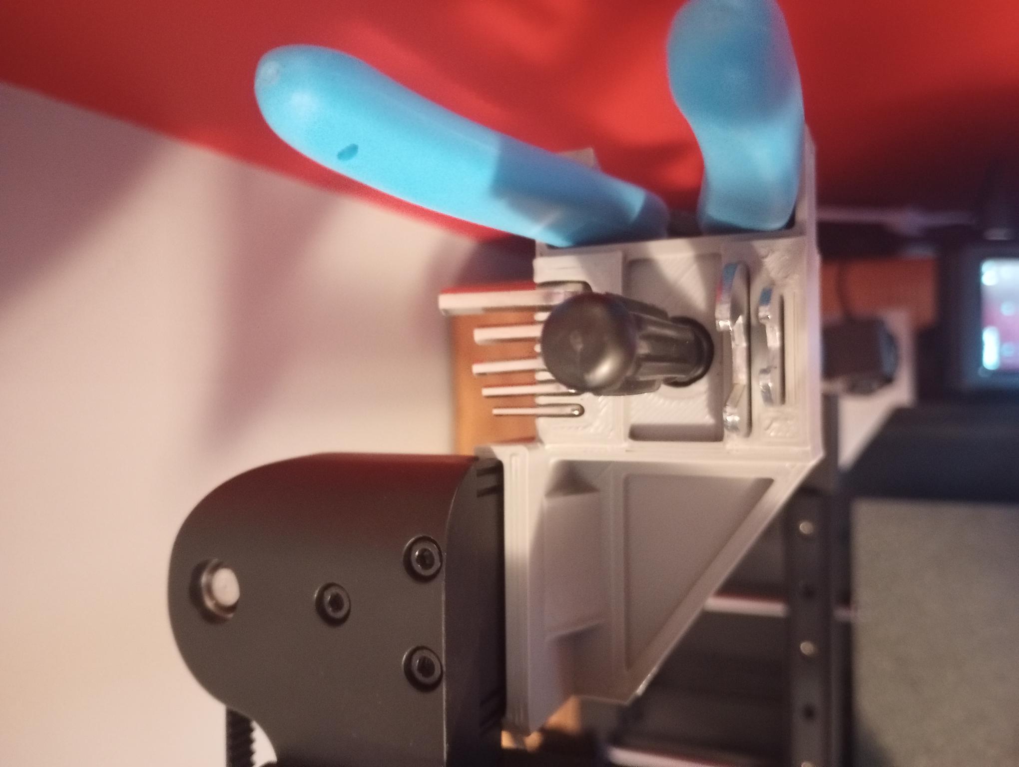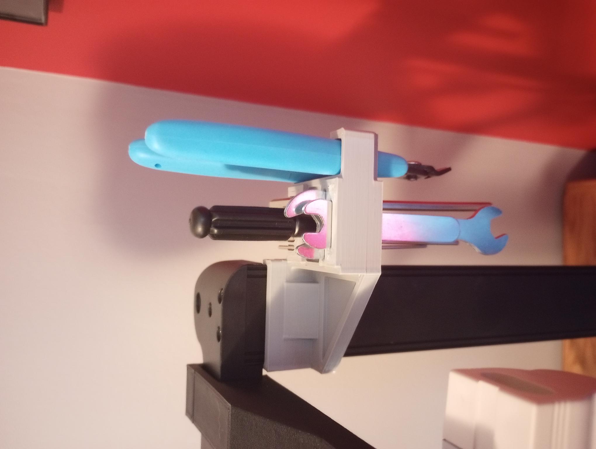 Cái kẹp giữ đồ nghề cho các dụng cụ đi kèm với máy Ender 3 v3 ke/Se, nó kẹp chắc vào thanh ray Z bên phía tay phải. Tui in cái của tui với 3 lớp tường và 25% lưới độn để tăng độ vững chắc. Không cần hỗ trợ.