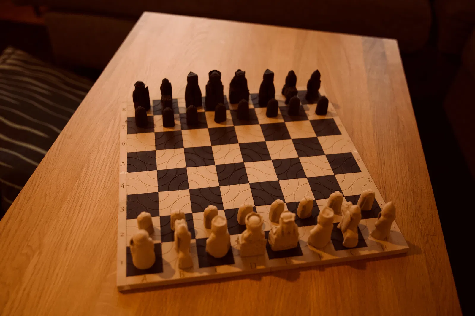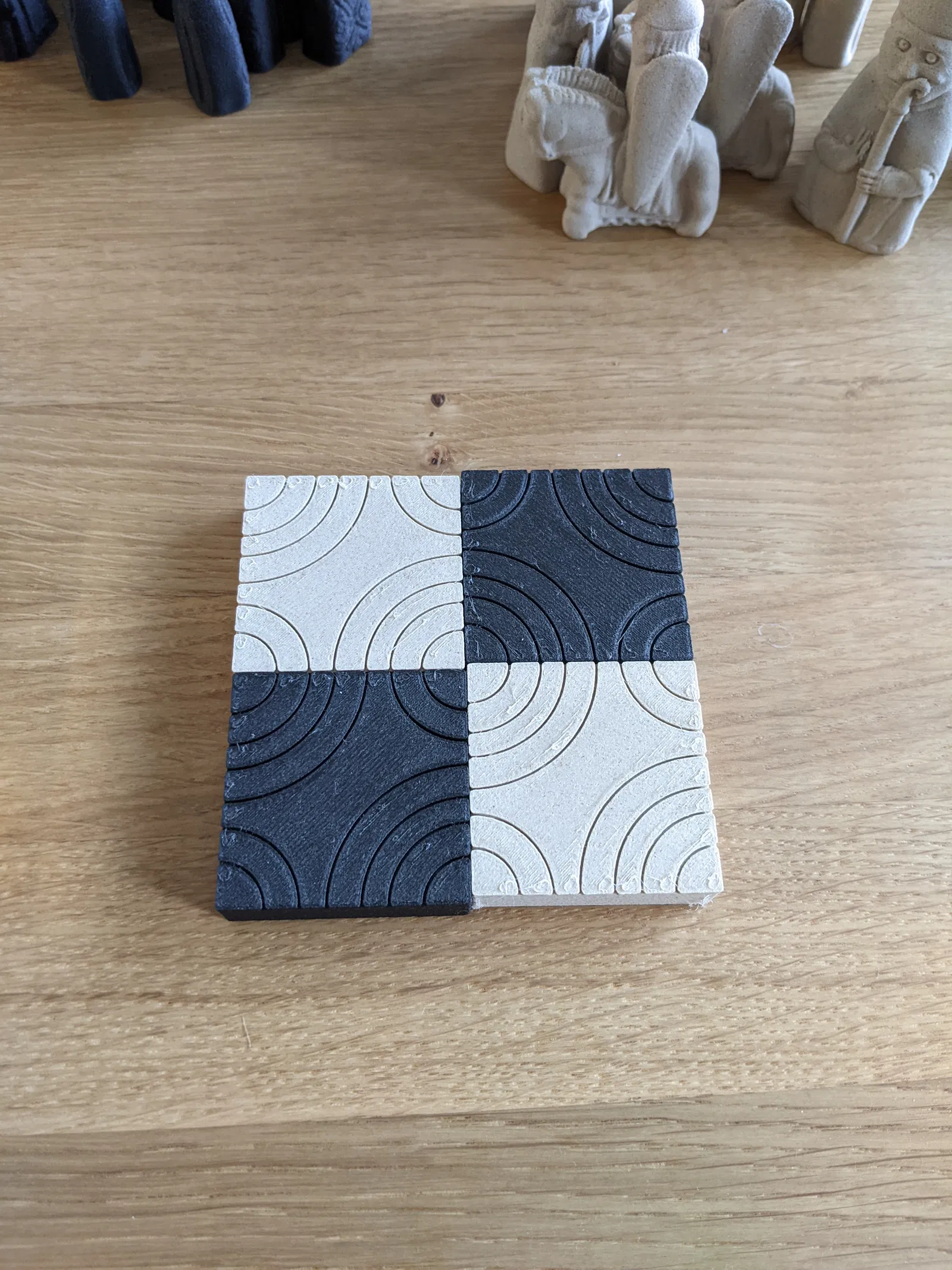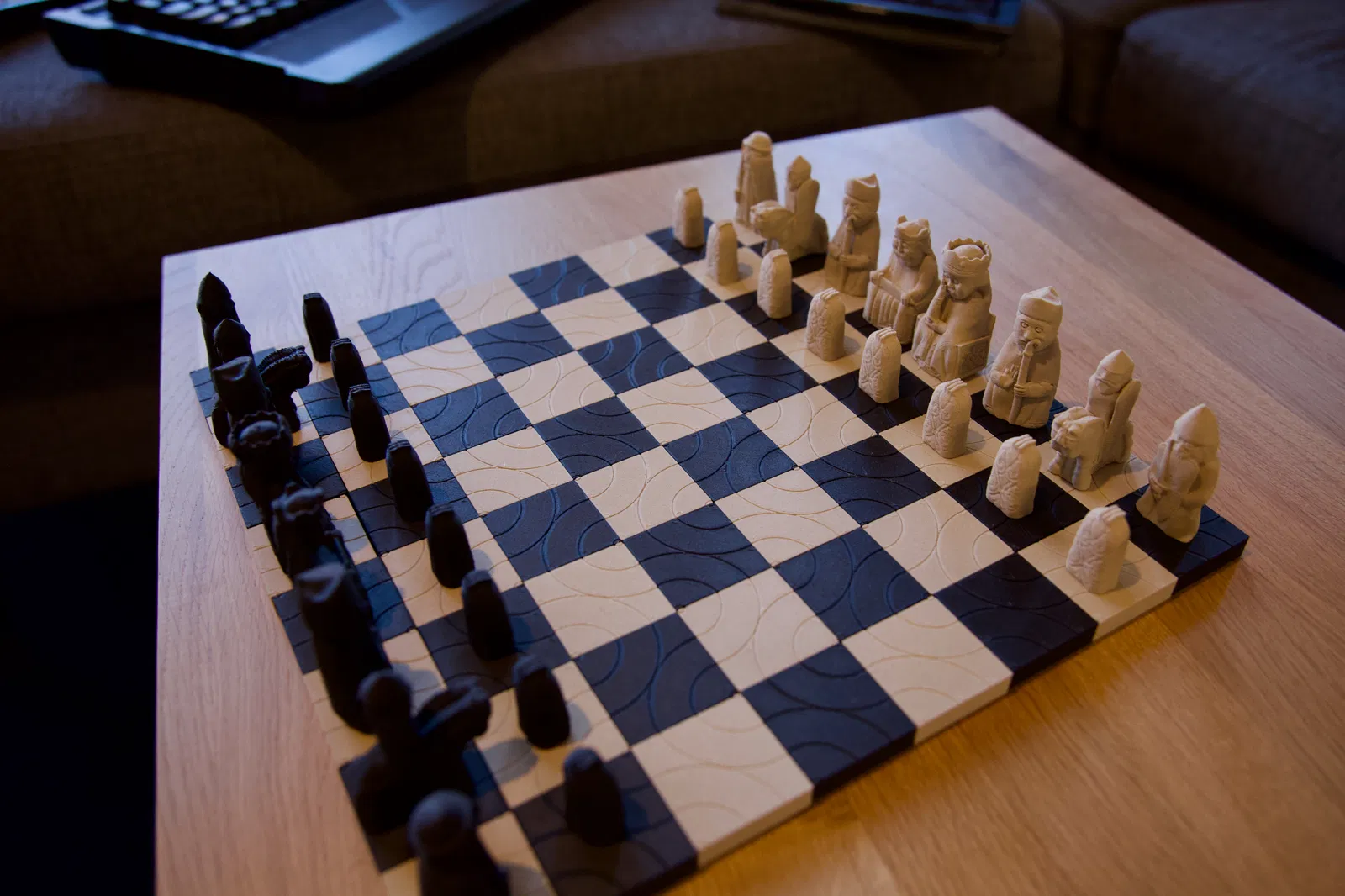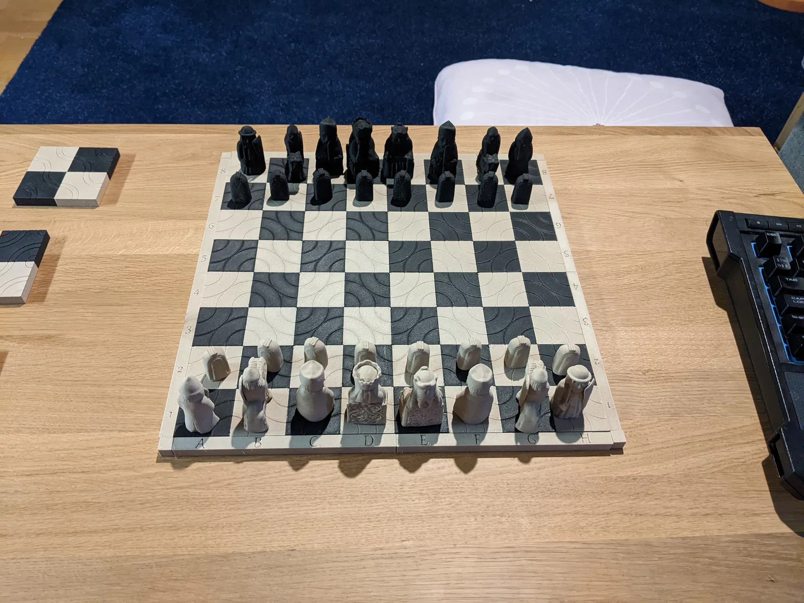 Tôi rất may mắn khi sở hữu chiếc máy in 3D đầu tiên vào cuối năm 2020 (Prusa i3 Mk3). Đương nhiên, trong lúc chờ đợi máy về, tôi đã lướt xem những thứ có thể in và tìm cảm hứng cho những gì mình có thể làm với nó. Bạn tôi nhờ tôi in cho anh ấy một bộ cờ vua. Khi đang lướt trên thingiverse, tôi cũng thấy các tệp cho https://en.wikipedia.org/wiki/Lewis_chessmen để in. Tôi nghĩ rằng mình cũng muốn có một bộ, nhưng tôi không có bàn cờ nào xứng tầm với những mô hình đẹp đó, vì vậy tôi phải tự thiết kế. Tôi nghĩ đến phong cách vẽ đường nét "kiểu chữ Rune Bắc Âu" vì những quân cờ nguyên bản đó có thể có nguồn gốc từ thương nhân Viking.
