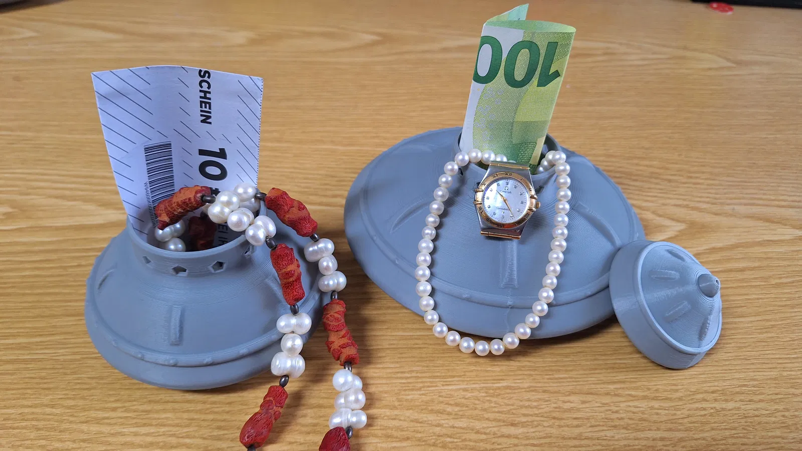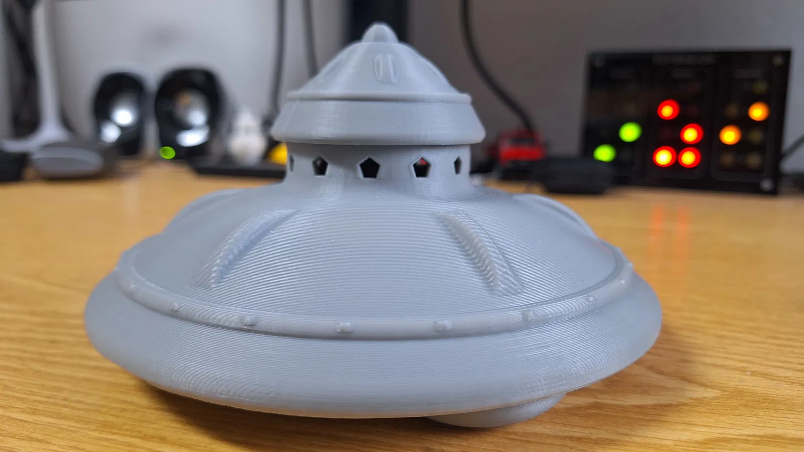 Mô hình UFO gồm ba bộ phận khác nhau, có thể in mà không cần vật liệu hỗ trợ và tiết kiệm vật liệu. Các phần cong ở mặt dưới nên được dán vào phần "đĩa". Phần vòm có thể gắn vào đĩa để dễ dàng mở ra lấy đồ bên trong.