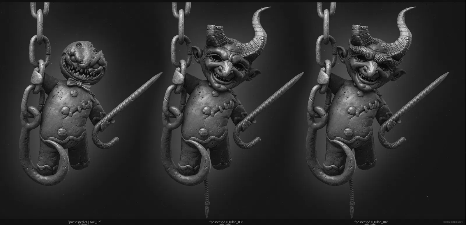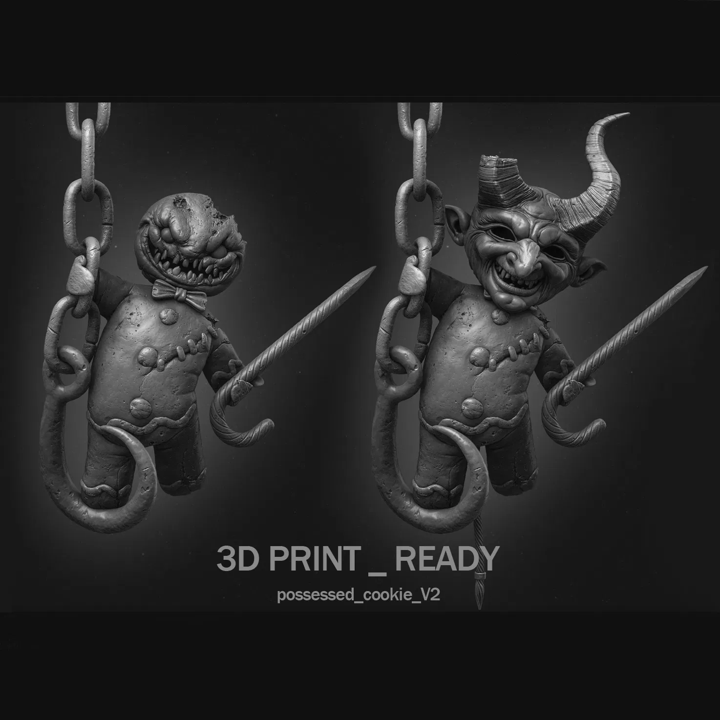 Phiên bản mới của "Bánh Gừng Ma Ám" với 2 loại mặt nạ, đuôi quỷ, kẹo gậy gãy... là phụ kiện độc đáo cho phòng khách hoặc lò sưởi nhà bạn. Bao gồm các file STL sẵn sàng in với support hoặc không, dễ dàng lắp ráp và trang trí.
