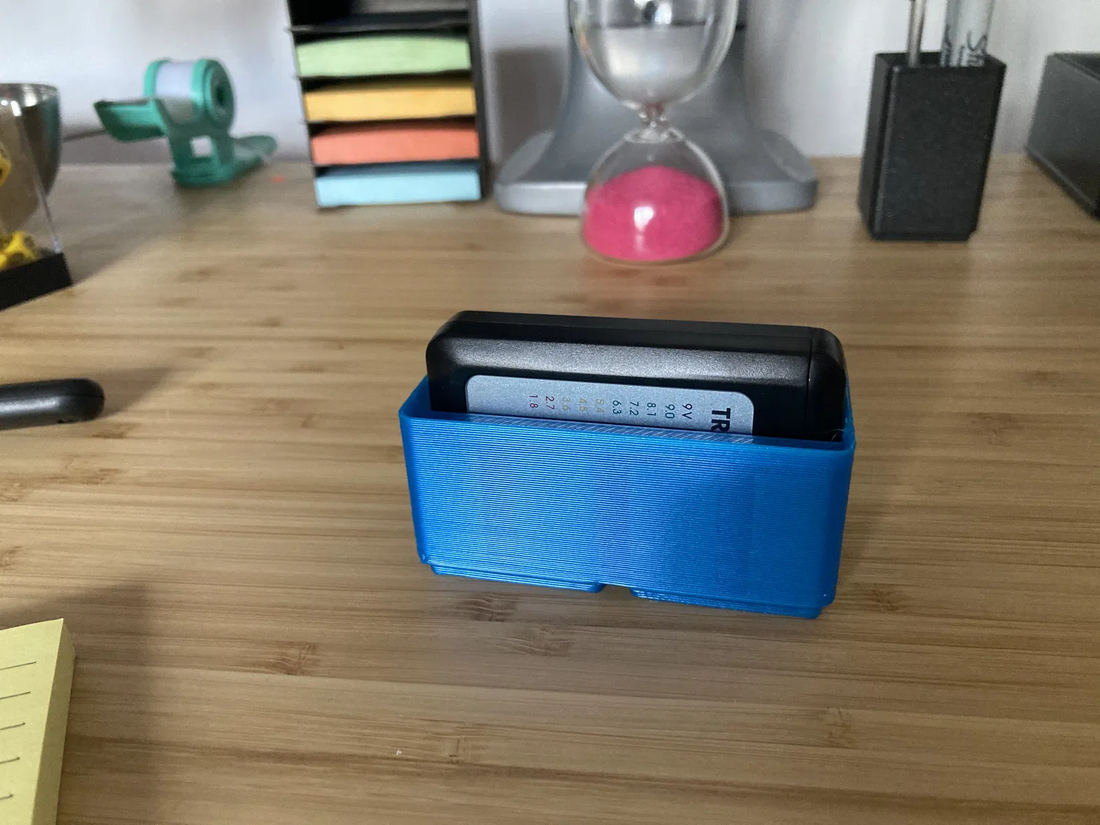 Tui in cái này bằng PLA màu xanh dương, không cần support với đầu phun 0.8, mà dù kết quả không đẹp lắm, cái đầu phun này đủ tốt để tui cất nó gần chỗ để pin của tui.